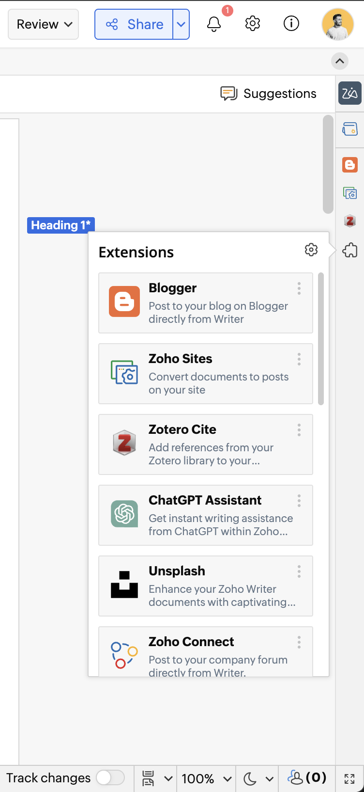 You can extend Zoho Writer’s capabilities by installing extensions from the Zoho Marketplace. Installing an Extension To install a Writer extension: Go to Zoho Marketplace → the Writer section → view available extensions. Use search (if needed) to ...