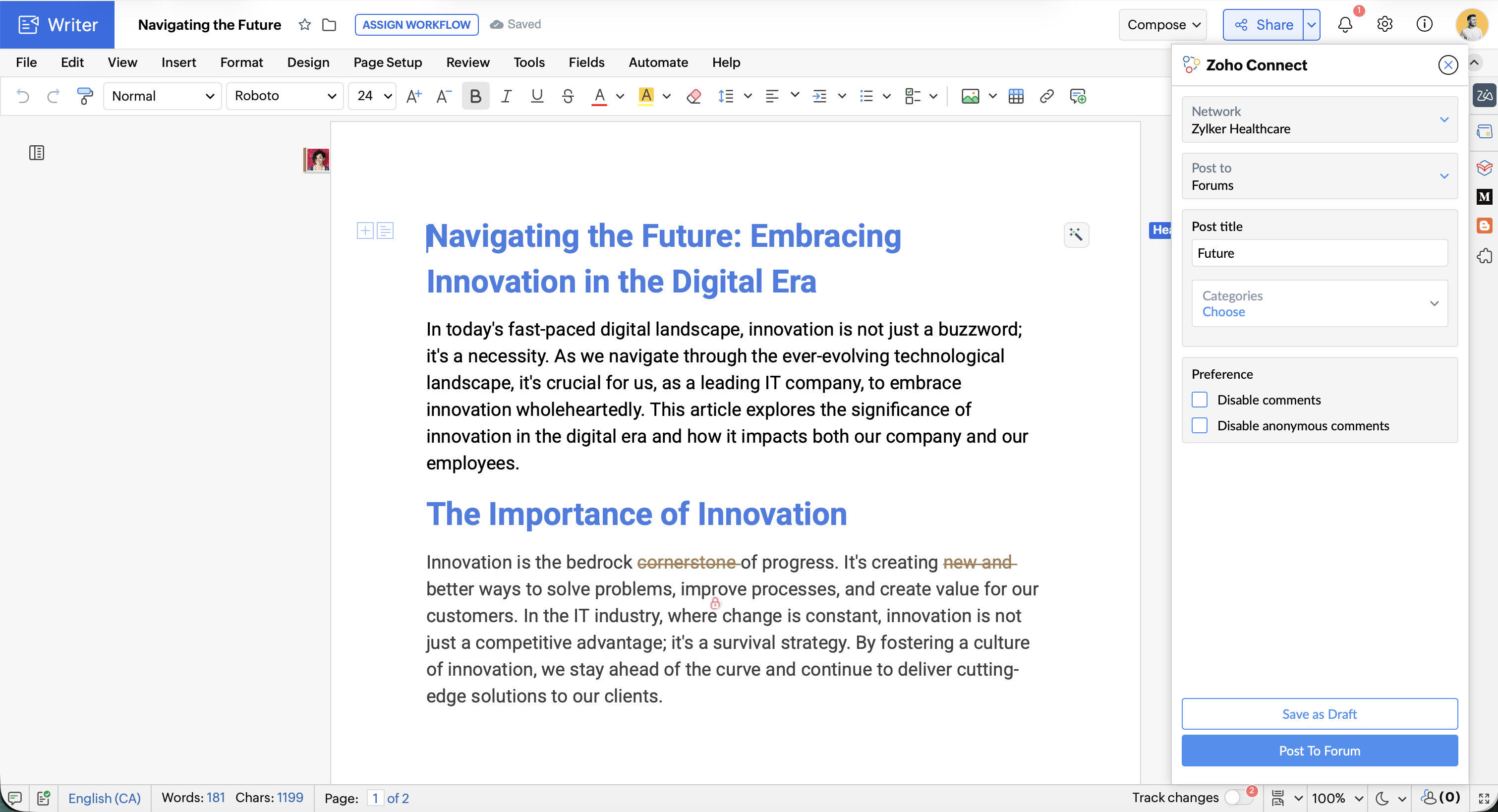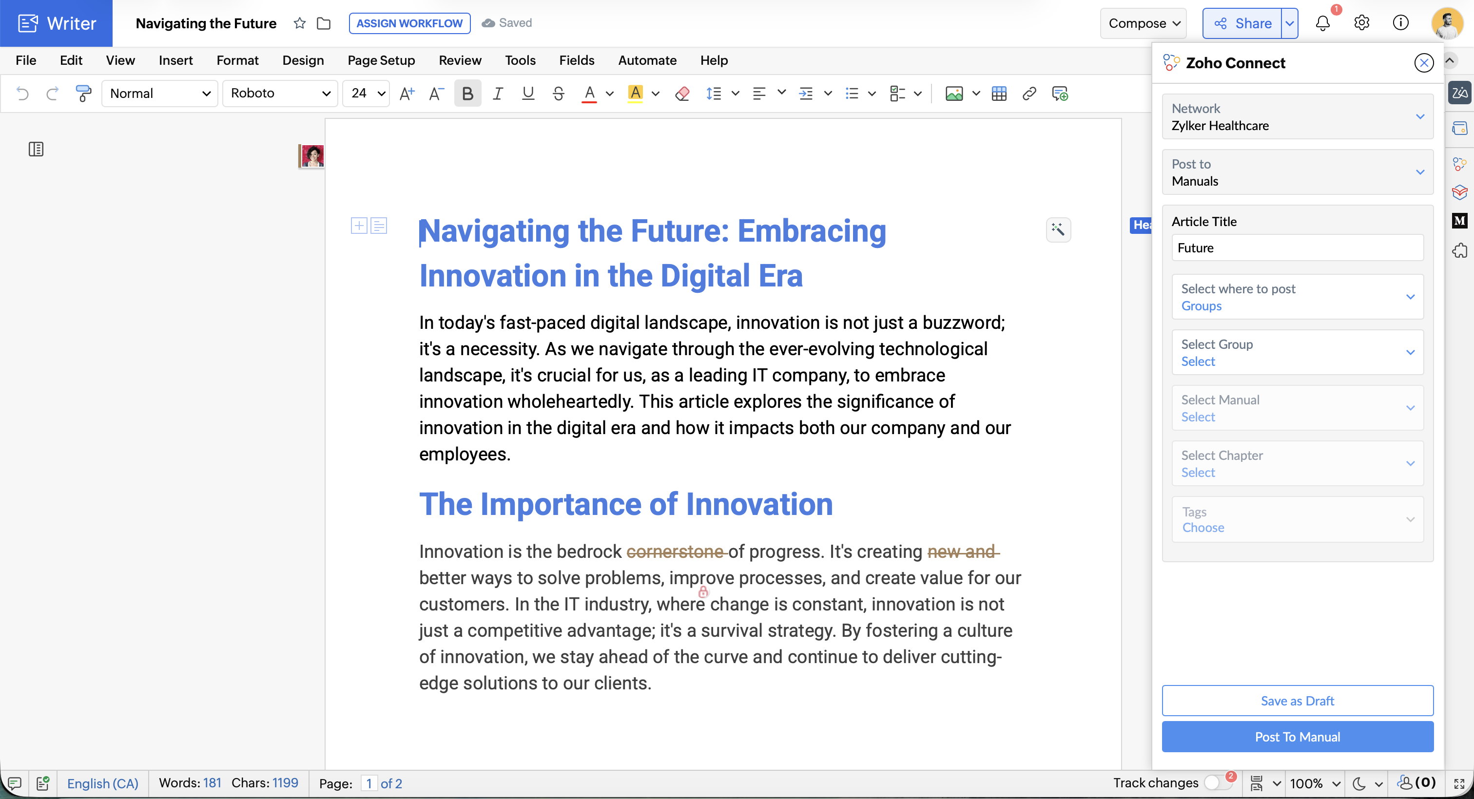 Use the Zoho Connection extension to post inside a forum or a manual within your Organization. Prepare a draft with the Writer editor and post it to Zoho Connect straight away. Make sure you have installed and authorized the Zoho Connect Extension from Marketplace. If not, follow these steps to do so.
