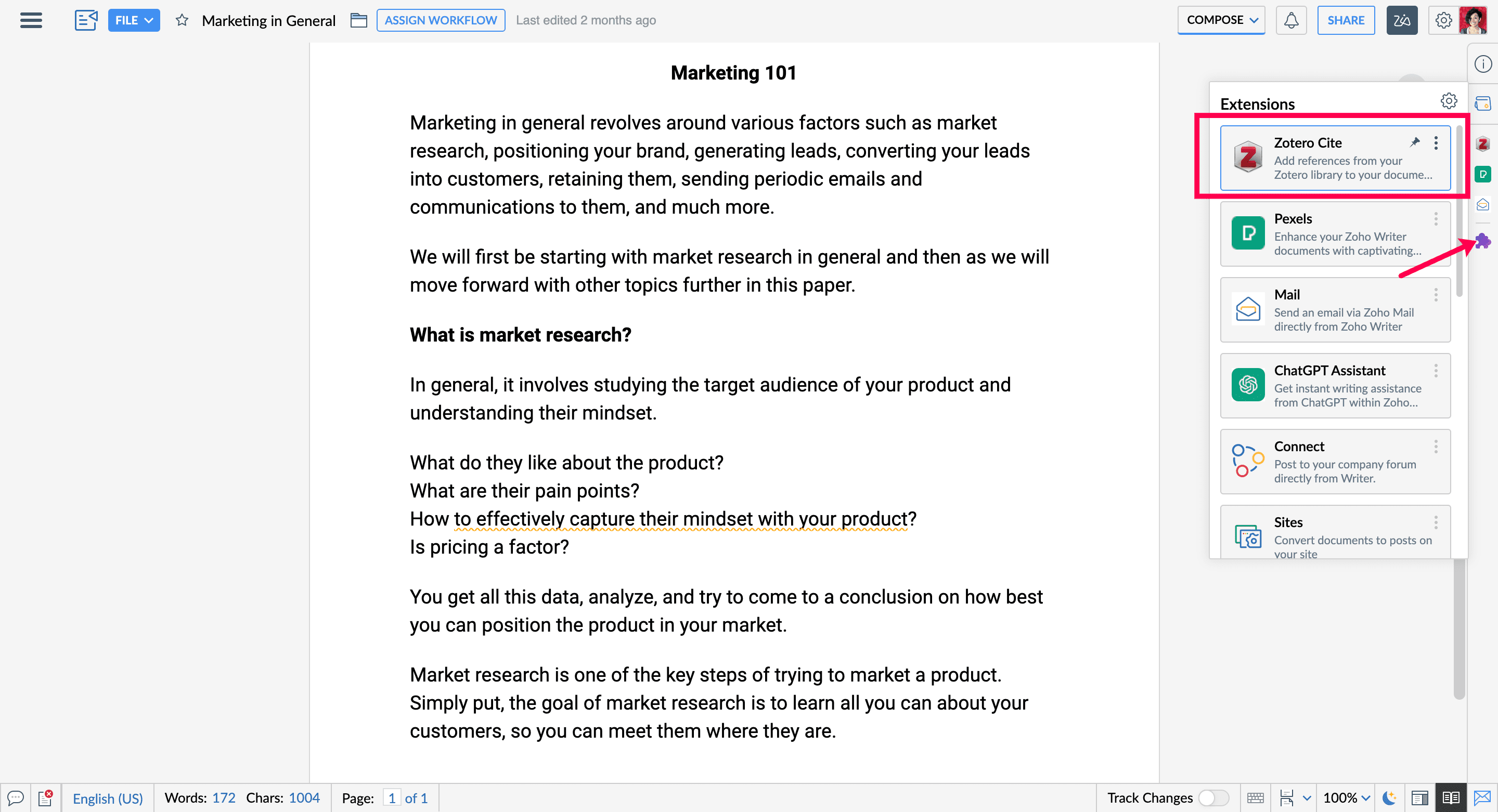 1. Install the Zotero extension from marketplace.zoho.com in Writer.