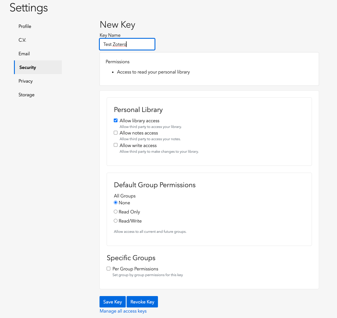 1. Log in to zotero.org → Profile → Settings → Security → Applications.