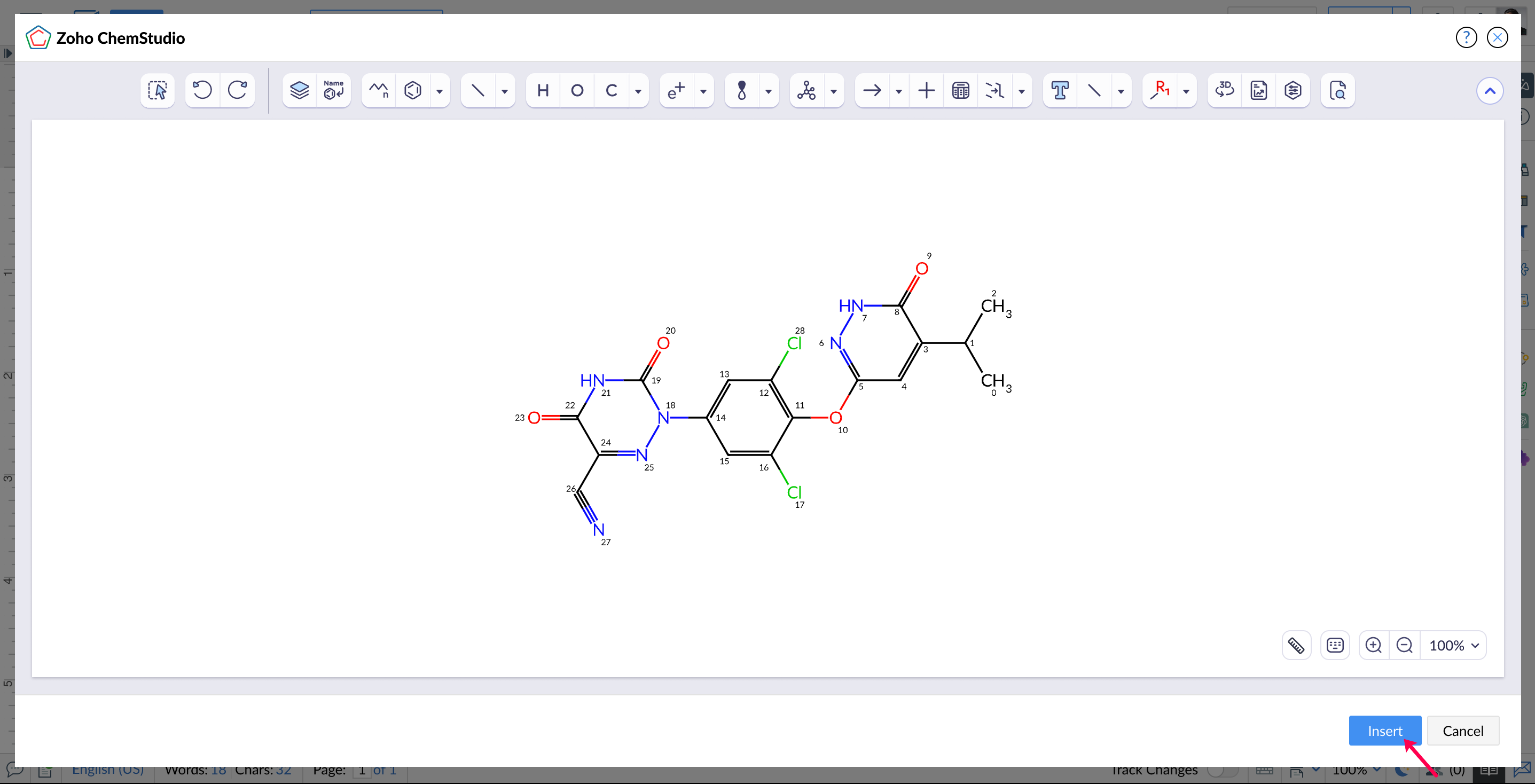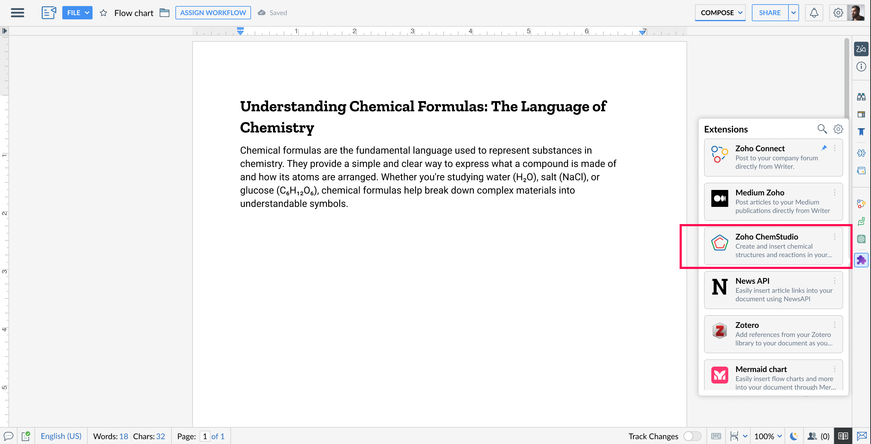 You can use the Zoho ChemStudio extension in Writer to insert chemical structures that you’ve drawn in ChemStudio directly into your document as images. This helps you create professional documents without switching between tools.