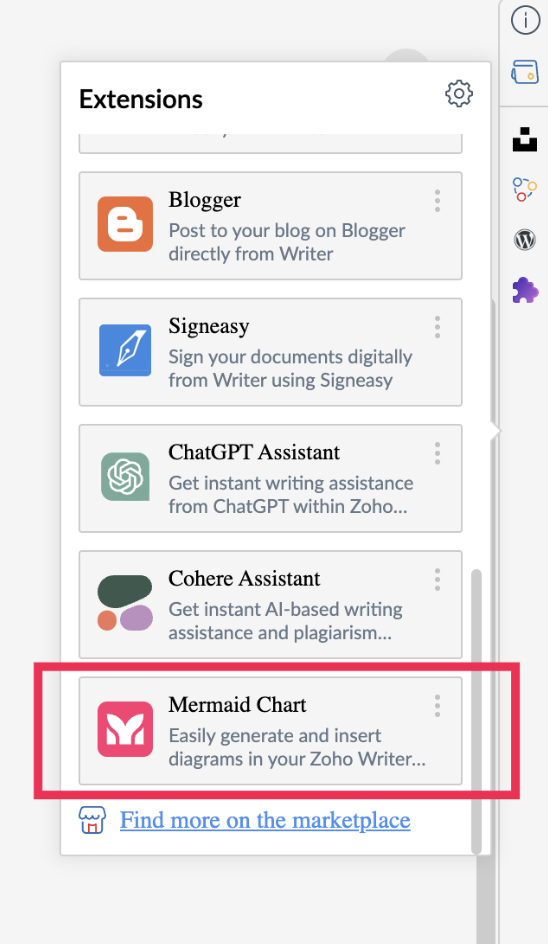 - In the Writer document, click the Extensions icon located at the right corner of the editor, and click the Mermaid extension.
