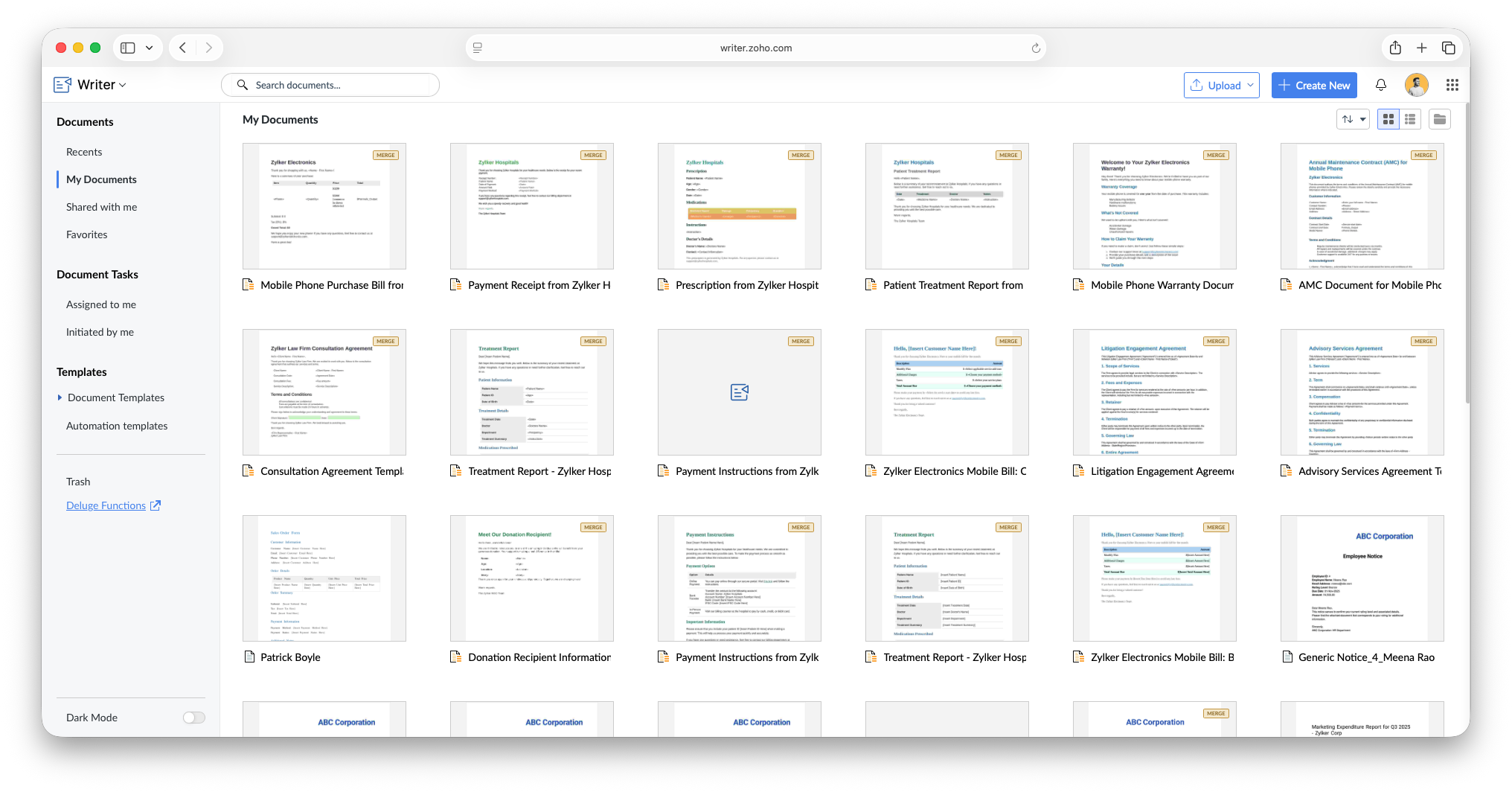Writer's new dashboard is a one-stop place to view all of your documents and templates. To access it, go to writer.zoho.com from your browser.
