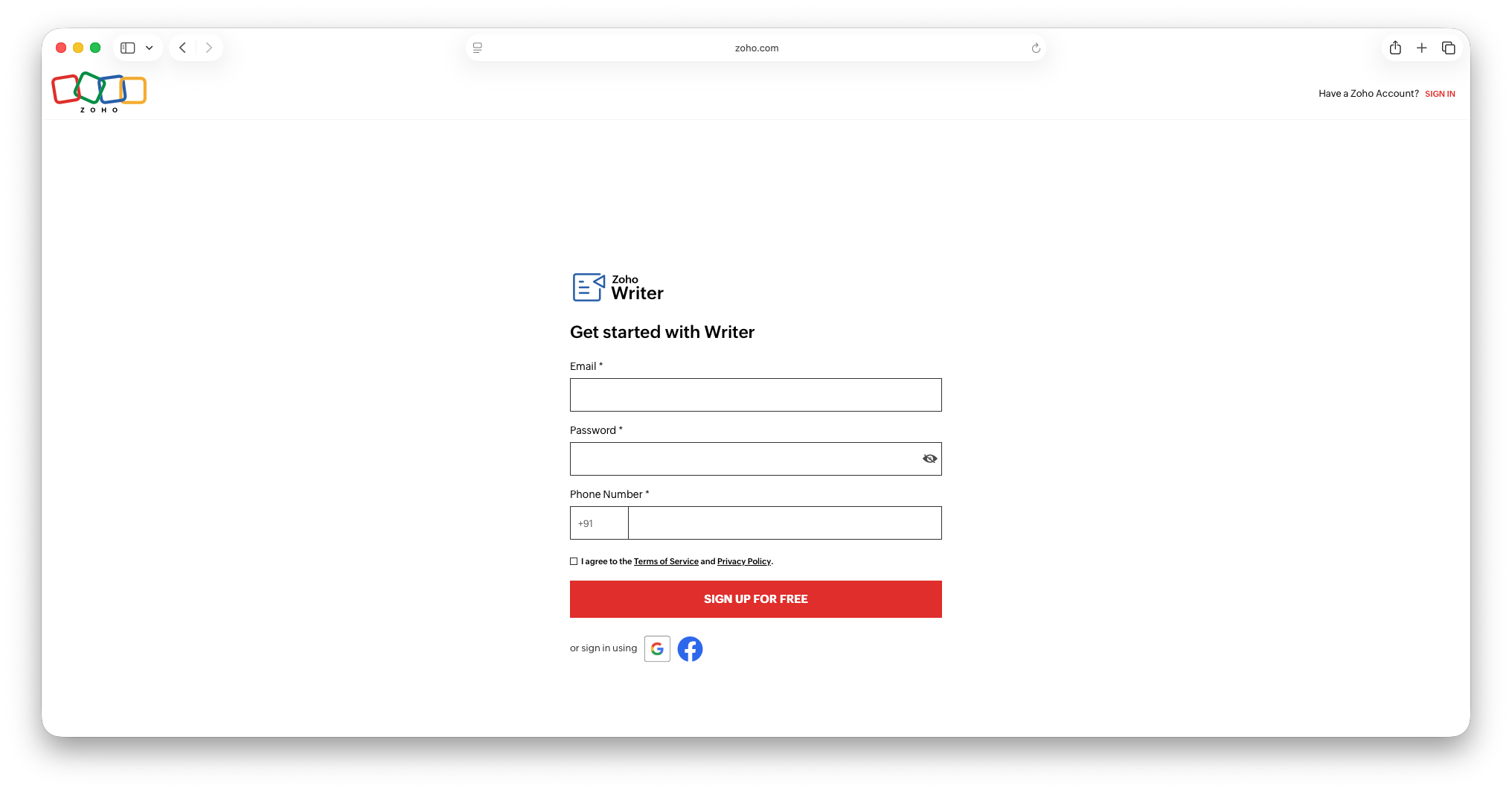 If you have already logged in with your Zoho account, you will be automatically redirected to the Writer's dashboard page.