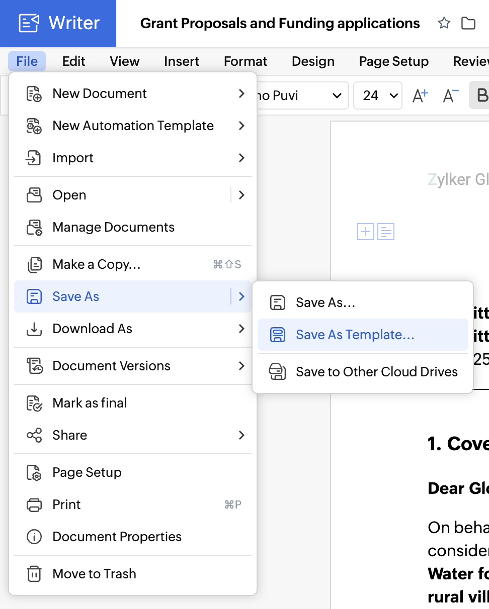 Zoho Writer provides admins the options to save specific Zoho Writer documents or templates as organization templates, making them accessible to everyone in the organization. This ensures consistency in branding and content when creating business documents such as MOM, press releases, and reports.