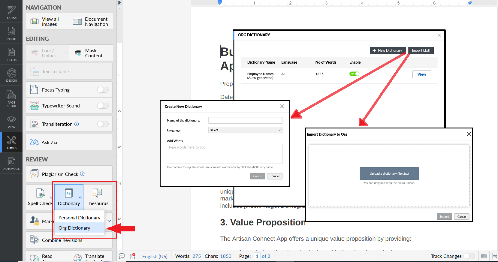 Zoho Writer allows you to upload a dictionary containing words or terms that are specific to your industry, domain, or company. This helps you to avoid words that are commonly used in your organization from being highlighted as errors by Zia, Writer's smart writing assistant.