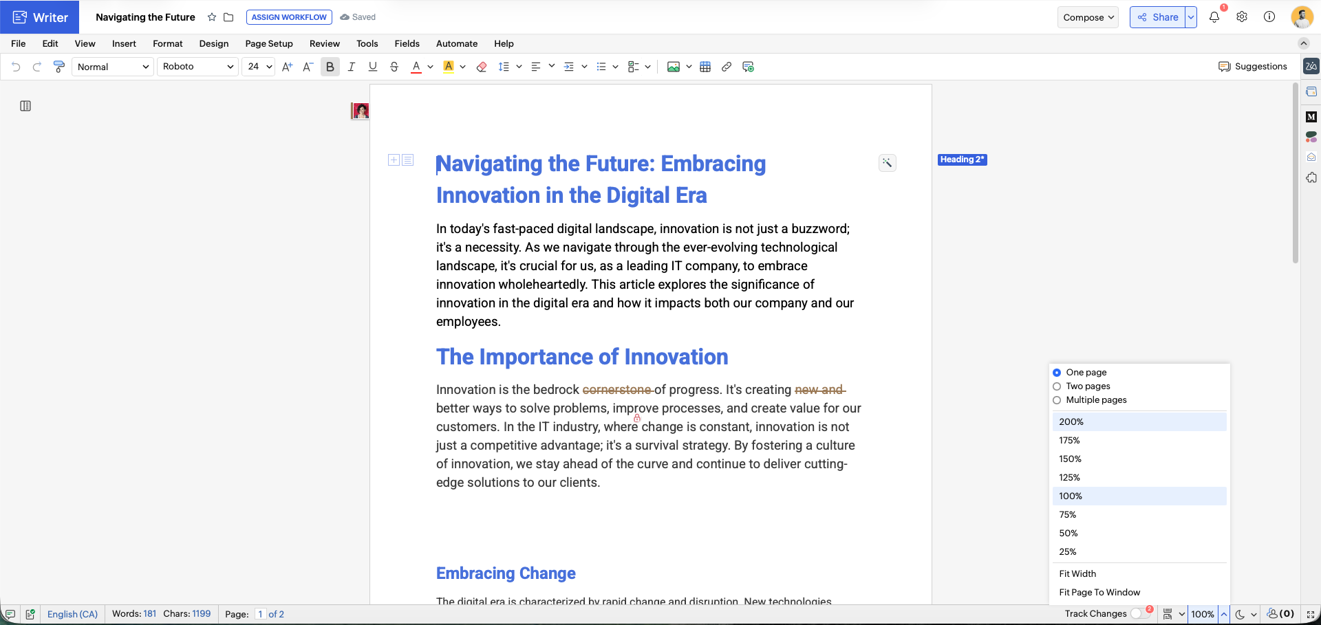 Zoho Writer provides flexible options to help you work more comfortably and efficiently with your documents. You can switch between Page View and Web View layouts, adjust zoom levels or use multi-page layouts for a bird’s-eye view, show or hide elements such as images, bookmarks, and grid lines, enter Full-Screen Mode for distraction-free writing.