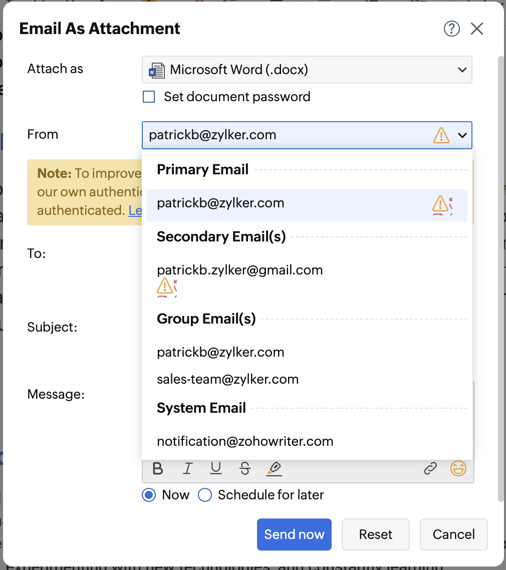 You can choose a specific email address that you wish to be used as the from address when you email a Zoho Writer document from within the Writer editor. Besides preventing your emails from ending up in the Spam folders, this will also help your collaborators to easily identify your documents.