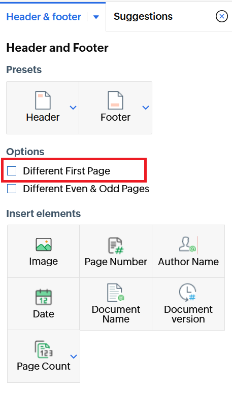 1. Double click the header on the first page. This will give you access to the Header and Footer options on the left panel.