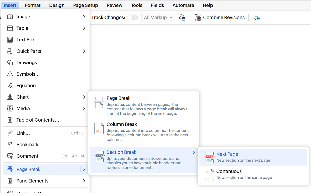 Navigate to Insert Tab --> Page Break > Section Break > Next Page. This begins a new section starting on the next page.