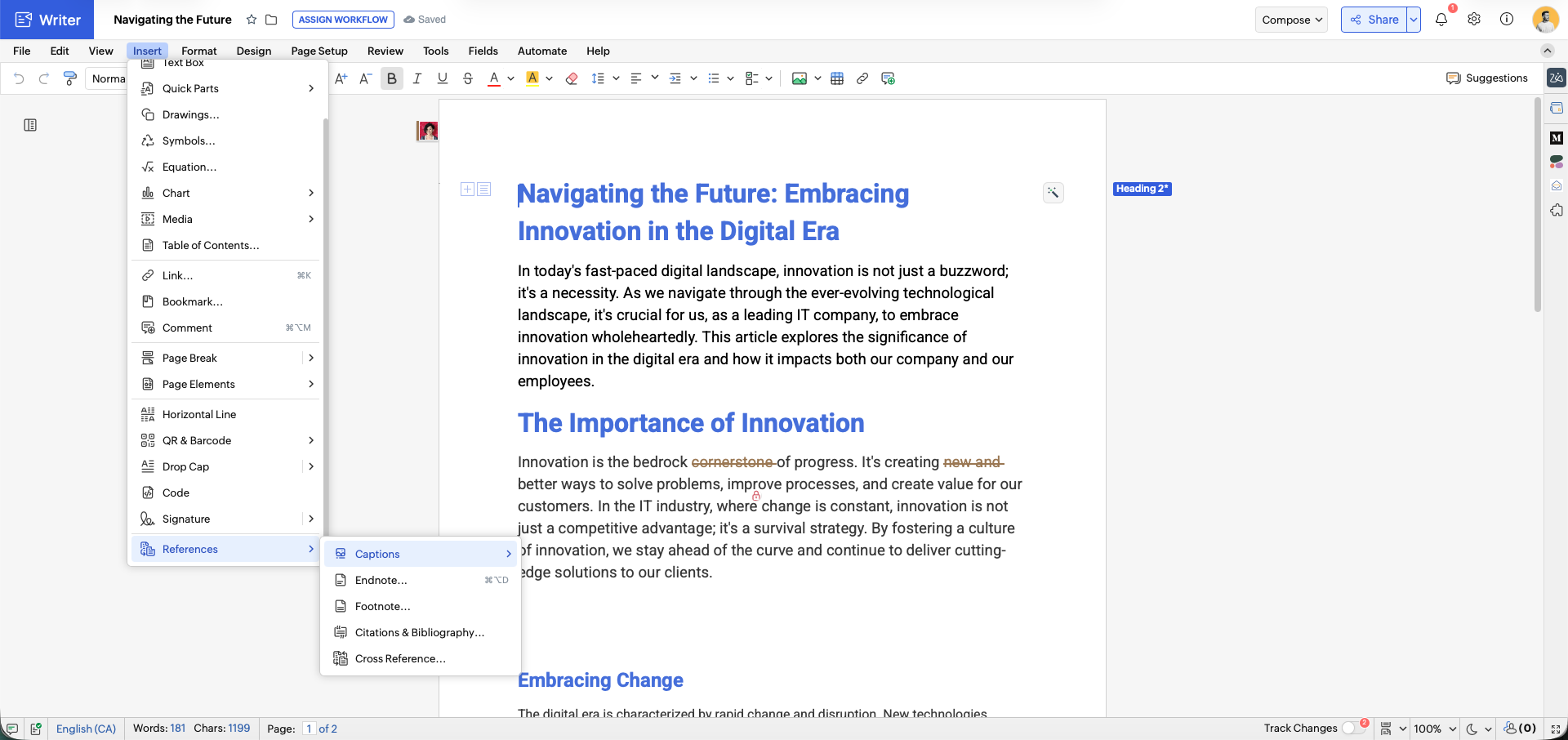 - Open your document in Zoho Writer and place the cursor where you want to insert a footnote or endnote.