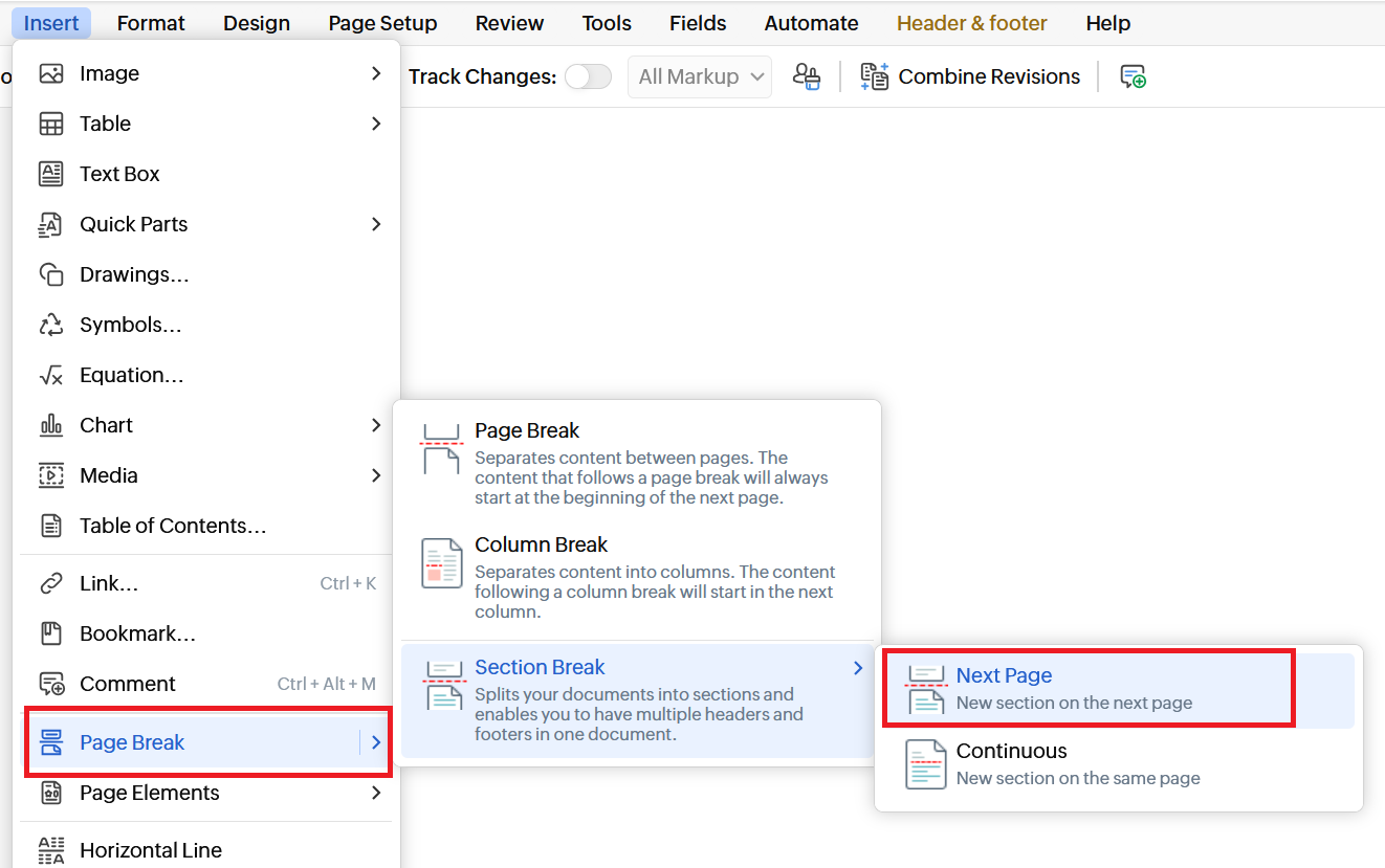 By default, Zoho Writer begins numbering pages from the first page and continues sequentially throughout the document. But what if you want the numbering to begin on, say, page 5—perhaps to skip a cover page or table of contents? The solution is to use a Section Break (Next Page) to divide your document into parts, then insert page numbers within the target section only. This gives you full control over where numbering begins.