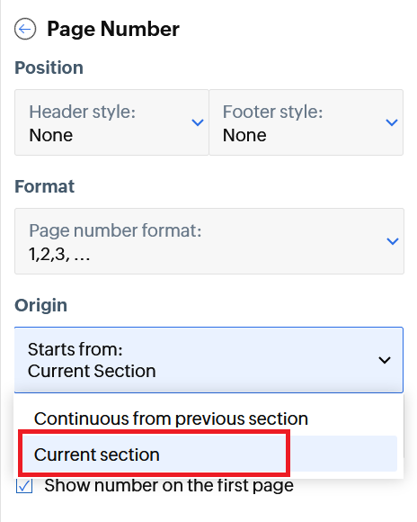 Step 2: Double click on the header area, and on the Header & Footer tab, go to Page Number, and under Origin, select Starts from Current Section.