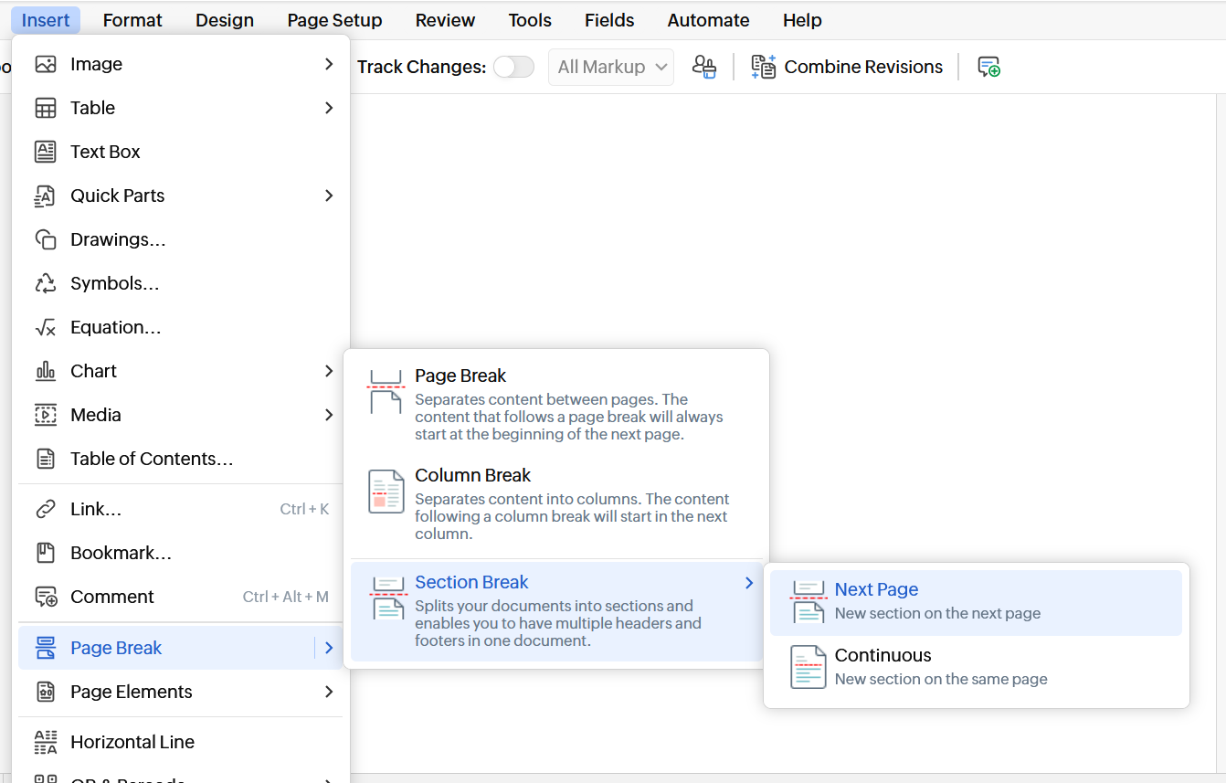 When you insert the next page section break, a new section will be started at the point of your cursor. Also, a page break will be inserted which means a new section starts on the next page. Each section can have different page orientations, page number styles, margins, etc.
