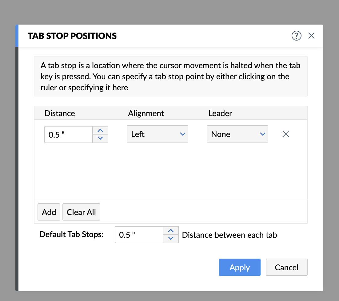 Click Add to include a new tab stop, or Clear All to remove existing ones.
