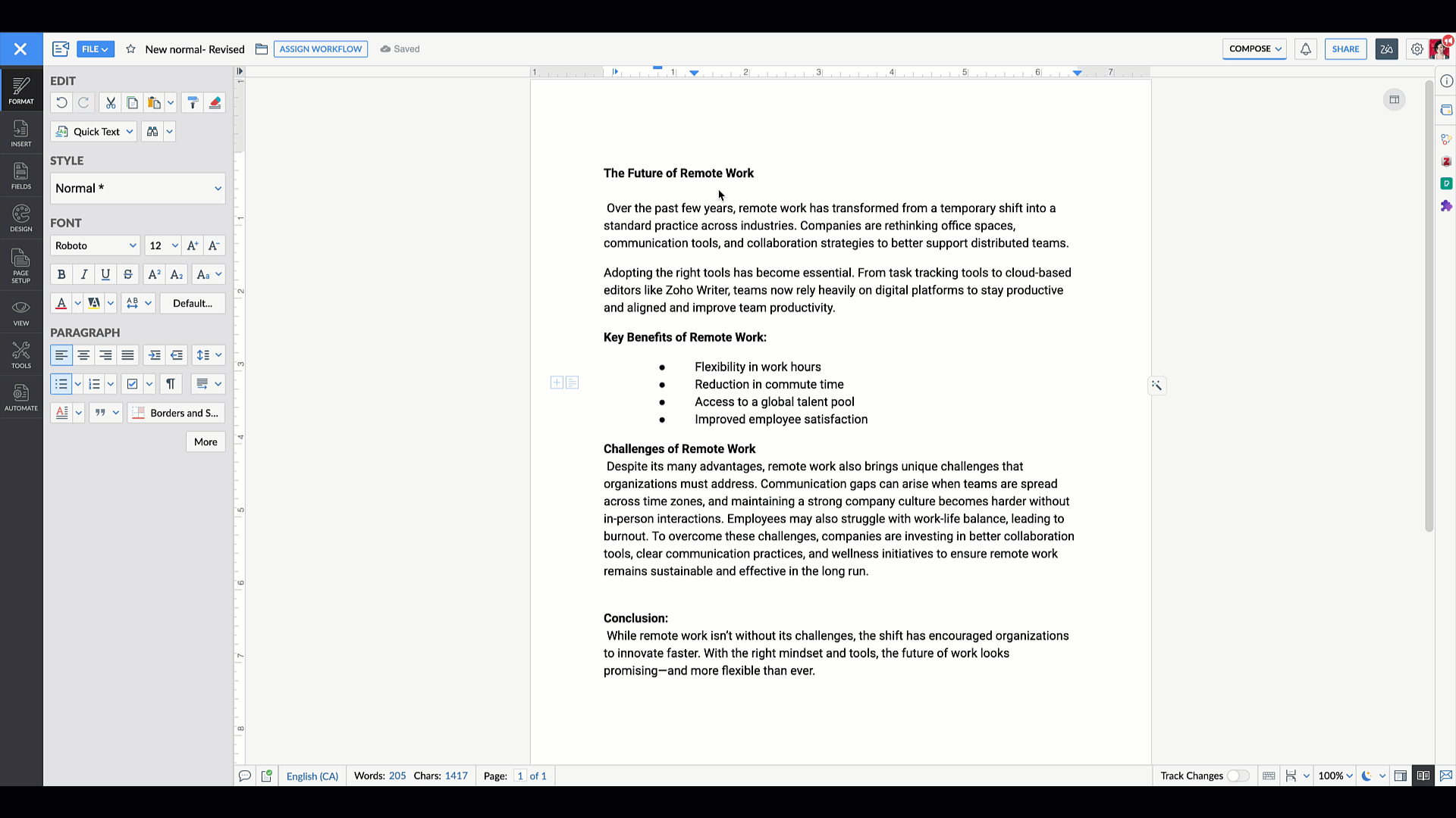 The document ruler in Zoho Writer acts as a visual guide for setting margins, adjusting indents, and adding tab stops. With the ruler enabled, you can quickly align paragraphs, structure tables of data, or position elements evenly across the page, making your document look cleaner and more professional.
