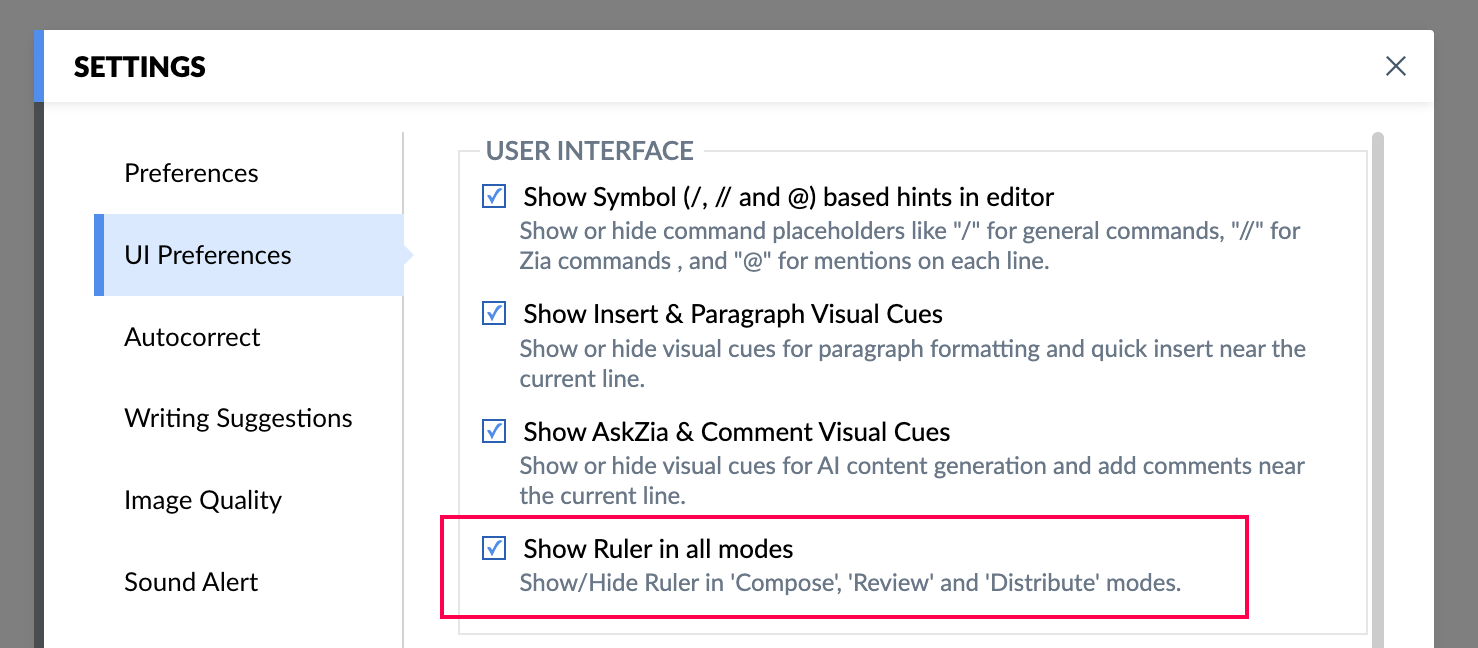 Under the User Interface section, check or uncheck Show Ruler in all modes. This displays the ruler in Compose, Review, and Distribute modes.