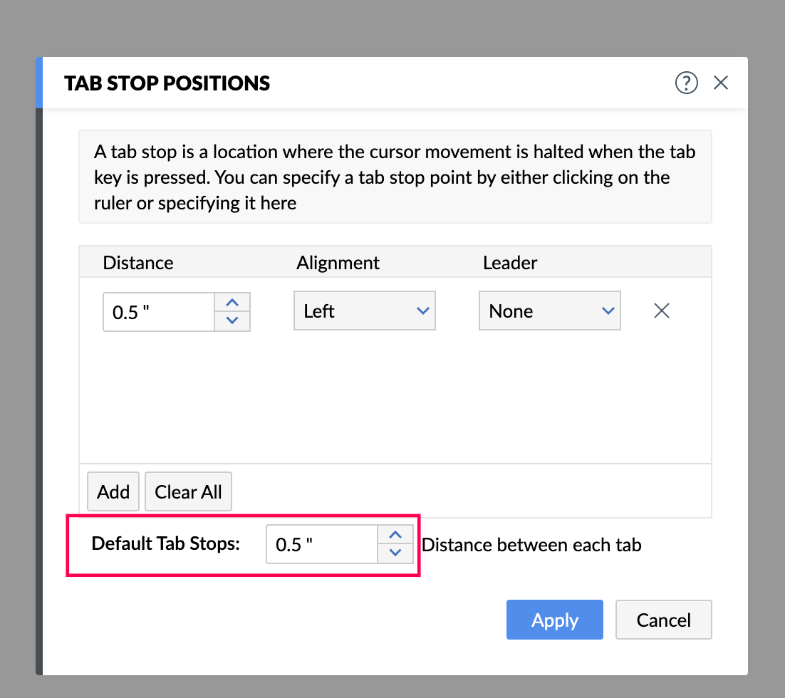 In the Default Tab Stops field, specify your preferred spacing (e.g., 0.5").
