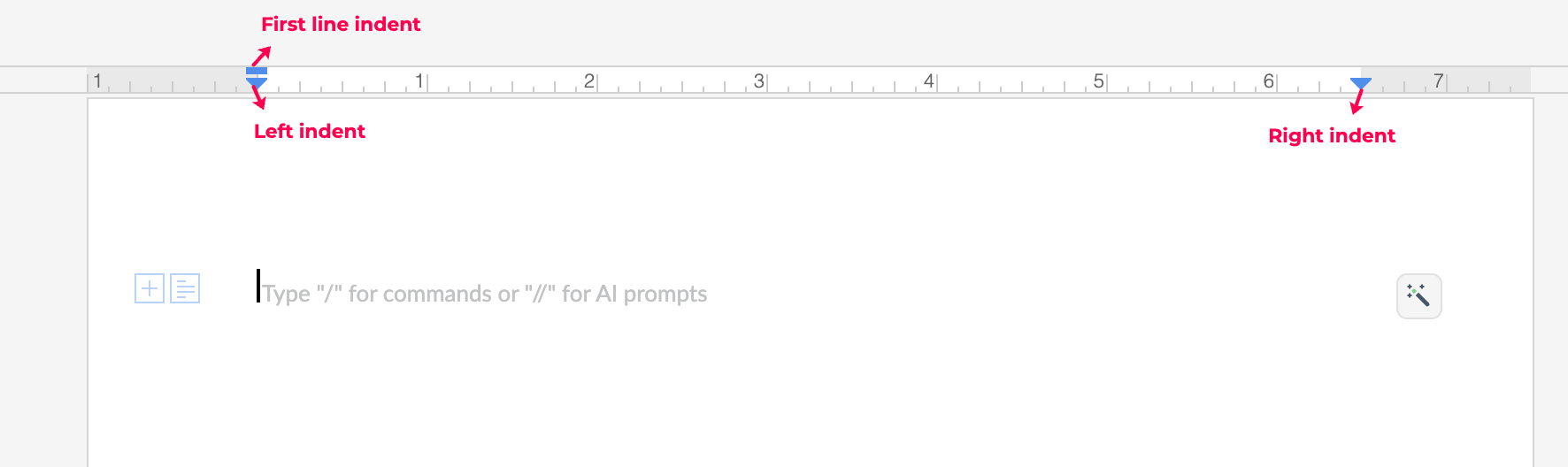 You can use the horizontal ruler at the top of your document to quickly set indents for any paragraph. Indentation helps define the structure of your document by controlling where each line of text begins.