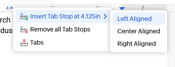 4. By clicking on the Tab Stop and selecting Insert Tab Stop , you can choose between Right, Left and Center alignments or even drag and drop the Tab Stop to a different location of your choice.