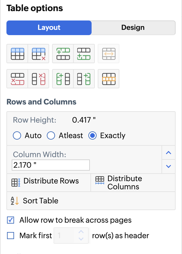 In Zoho Writer, you can freeze the size of table cells to maintain a consistent layout and prevent content from resizing cells automatically. This feature is especially useful when creating structured documents like invoices, forms, and reports where uniform cell sizes are required. By fixing row height and column width, you can ensure a neat and professional table design, regardless of the amount of text or data entered.