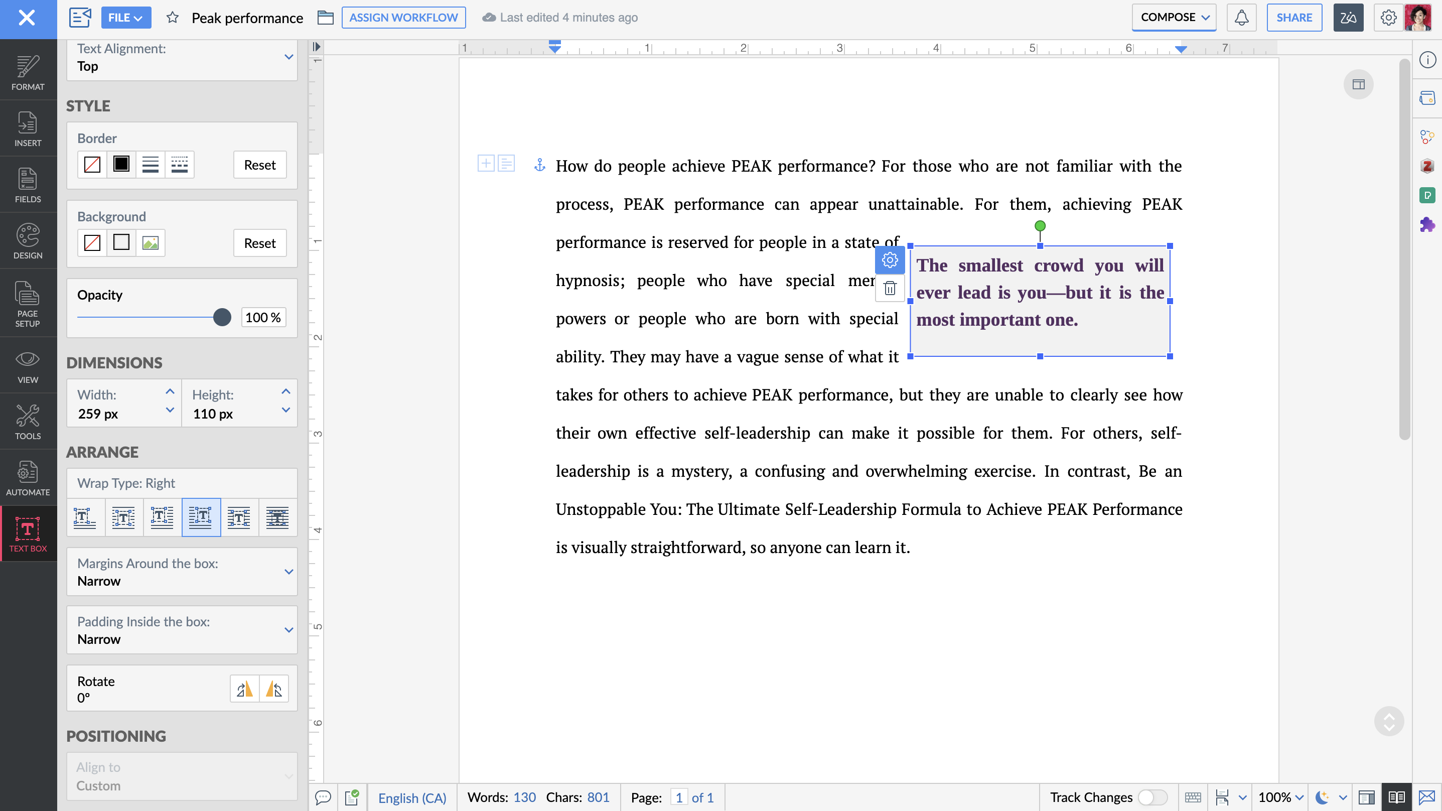 You can create pull quotes in Zoho Writer using text boxes. This method lets you customize the look and placement of the quote within your document.