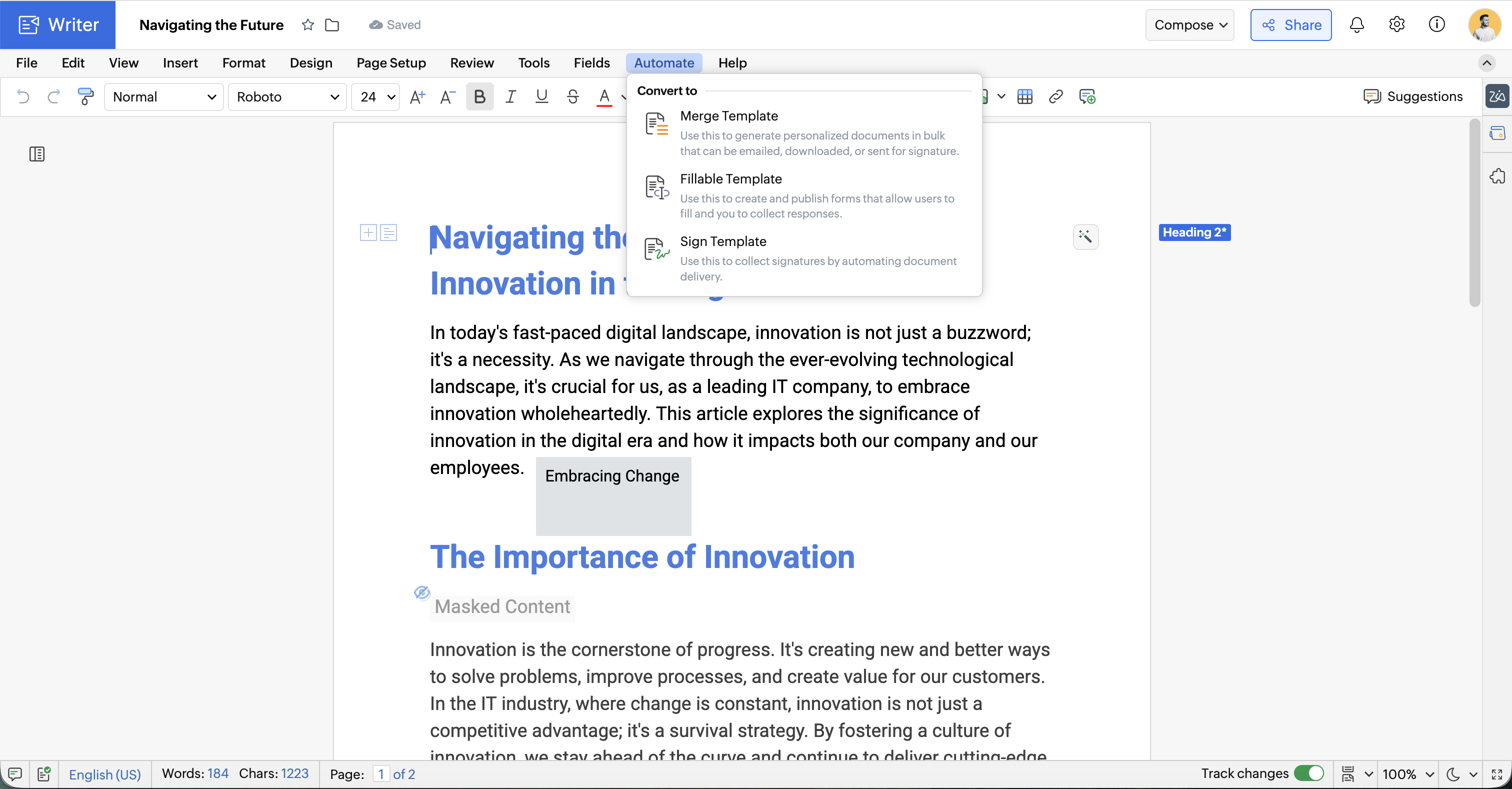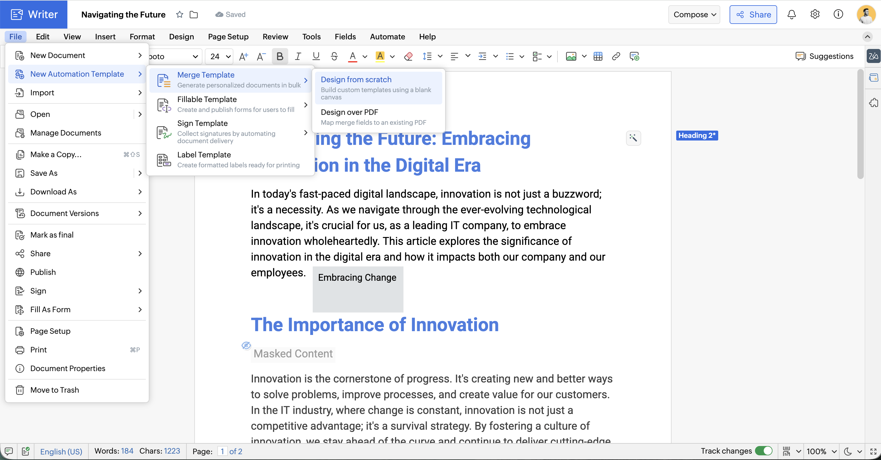 Zoho Writer’s template-based document generation lets you automatically create personalized documents by merging pre-designed templates with data from spreadsheets, forms, CRMs, or APIs. Merge fields pull in real data to generate contracts, invoices, proposals, and other documents at scale. With support for conditional logic, tables, and image merging, Zoho Writer streamlines accurate and efficient document automation.When your document automation involves multiple templates or multi-step automation and distribution, Writer lets you build sophisticated Power Automate–style document workflows. Learn more about Writer’s Automation Builder Steps