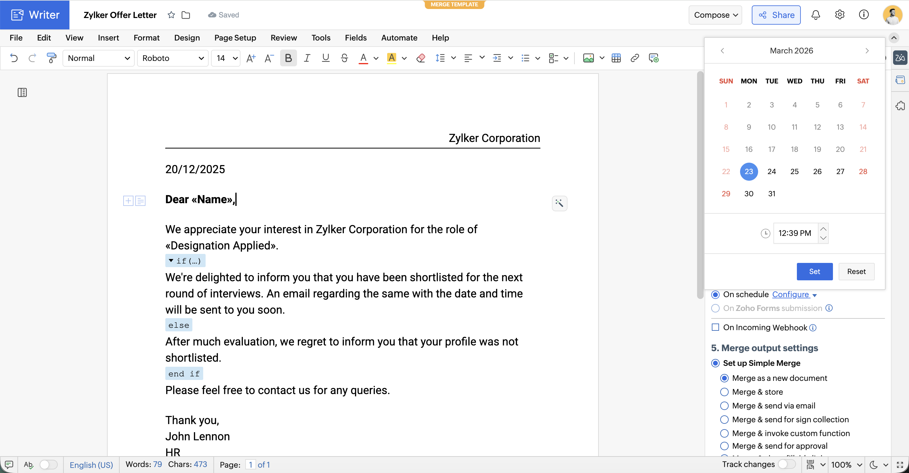 Note: Scheduling mail merge at regular intervals is currently not supported, but will be supported in future in Zoho Writer.