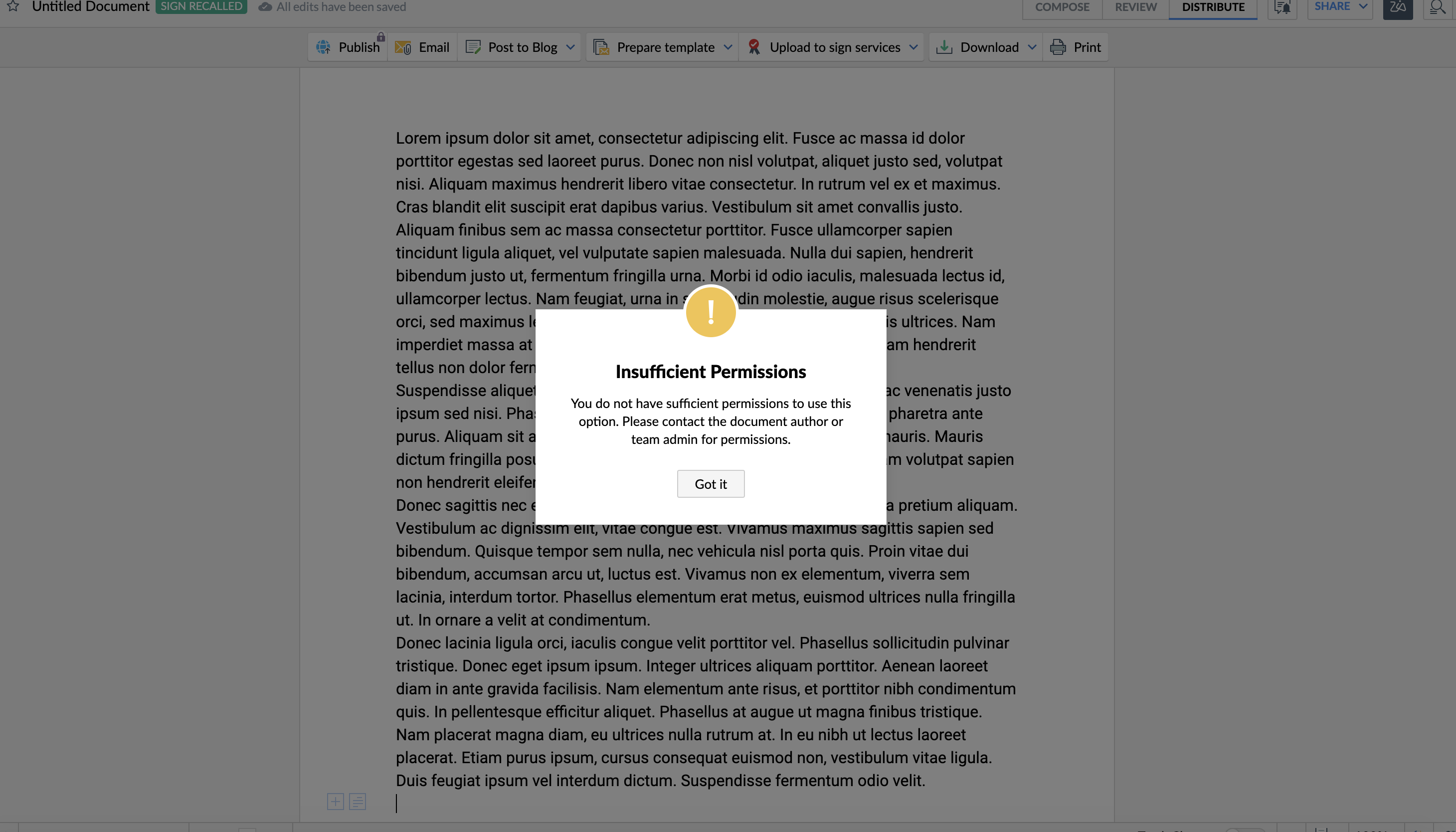 Hence, we have introduced the lock icon in Writer UI for better user experience. It will help the users who don't have permission to access specific features in that particular Writer document. When the users tries to access the locked feature, we will throw the 'Insufficient Permissions' message pop-up as shown below.