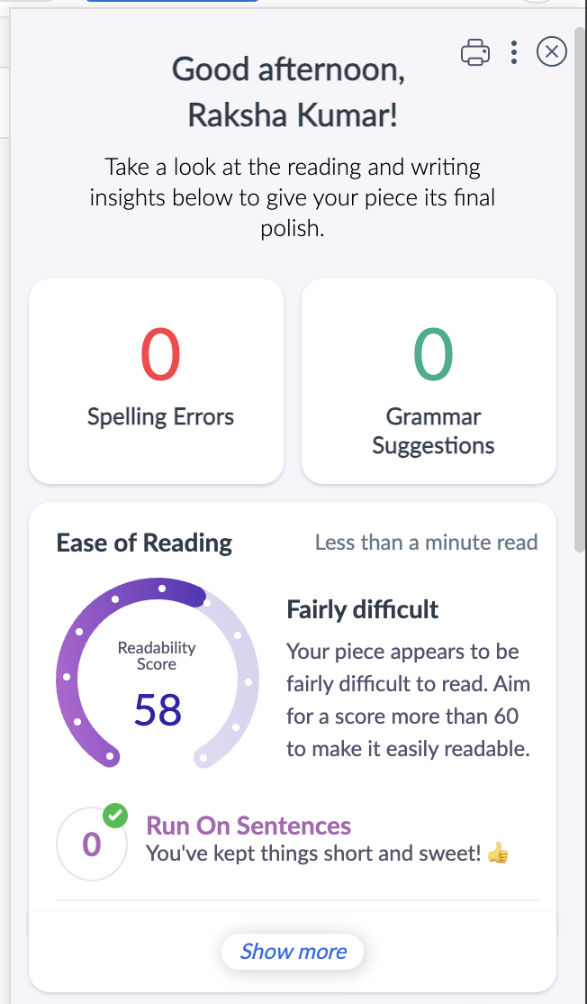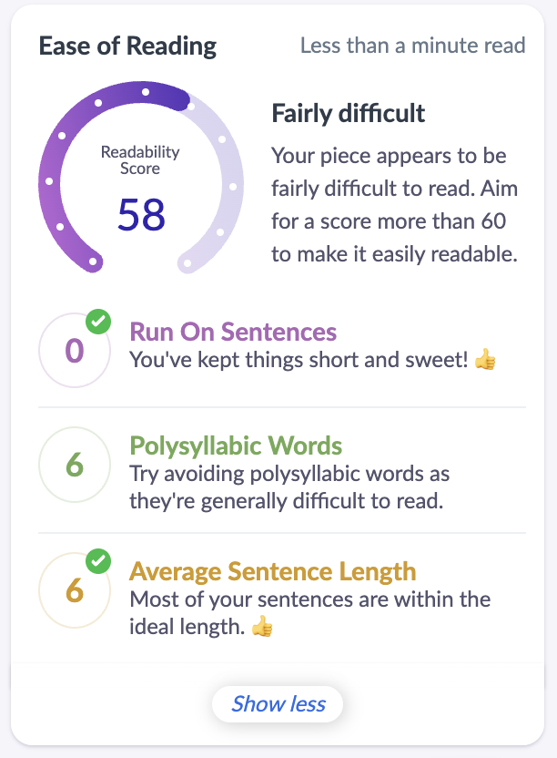 Writer uses the Flesch Readability Score to evaluate how easy your content is to read.