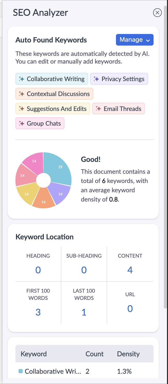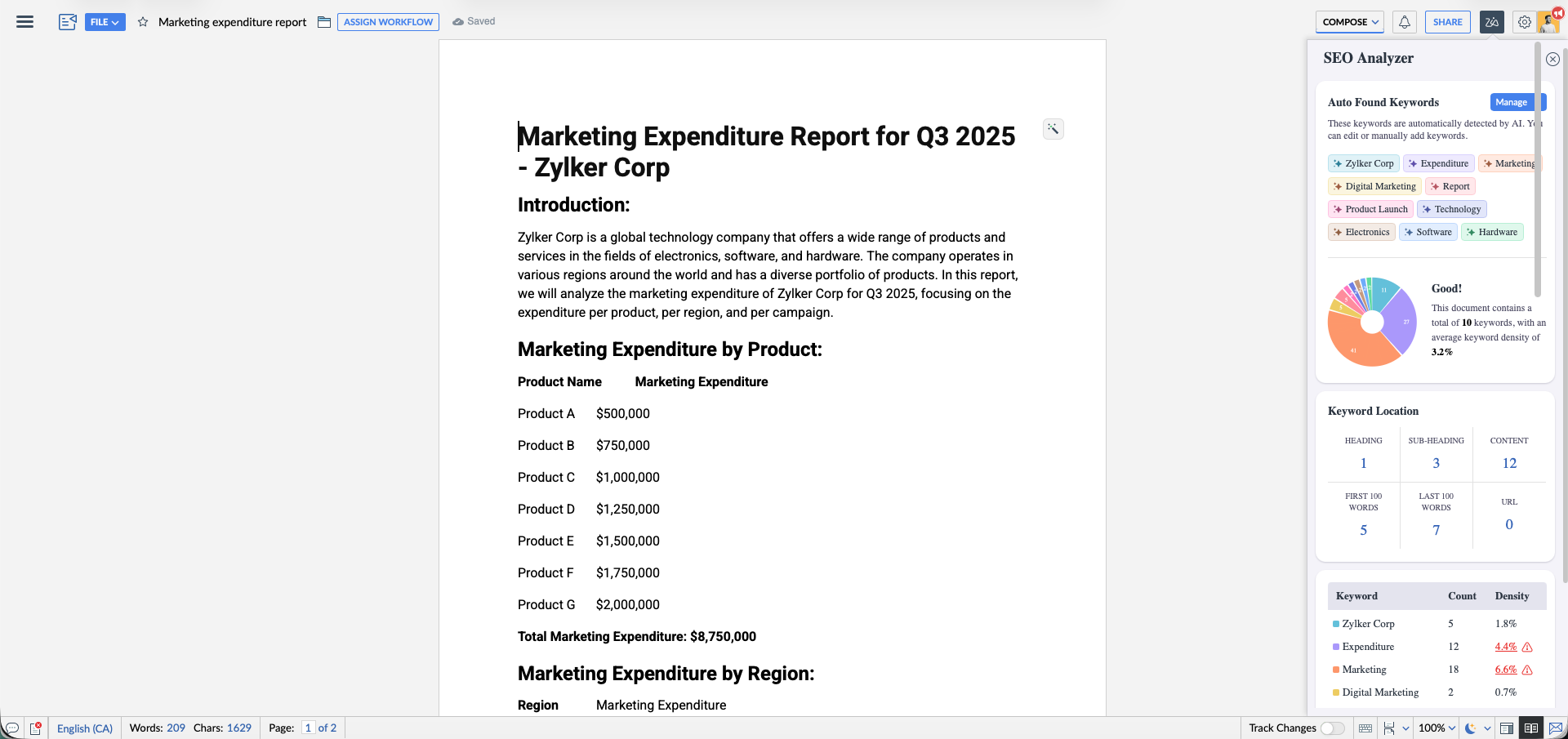 Zoho Writer’s built-in SEO Analyzer helps you optimize your document content for search engines without leaving the editor. It scans your content for keywords, identifies them, and shows their distribution so you can refine your writing for better visibility. It makes it easier for bloggers, marketers, and businesses to write SEO-friendly content directly inside Zoho Writer.