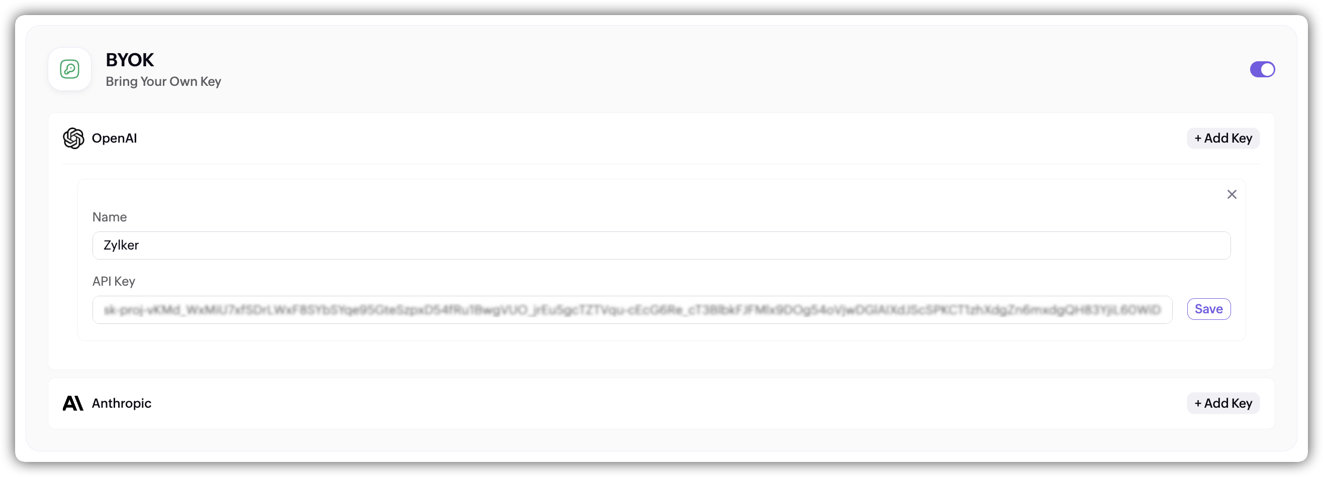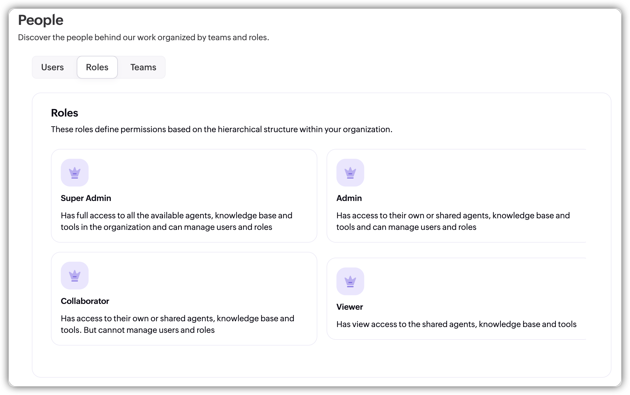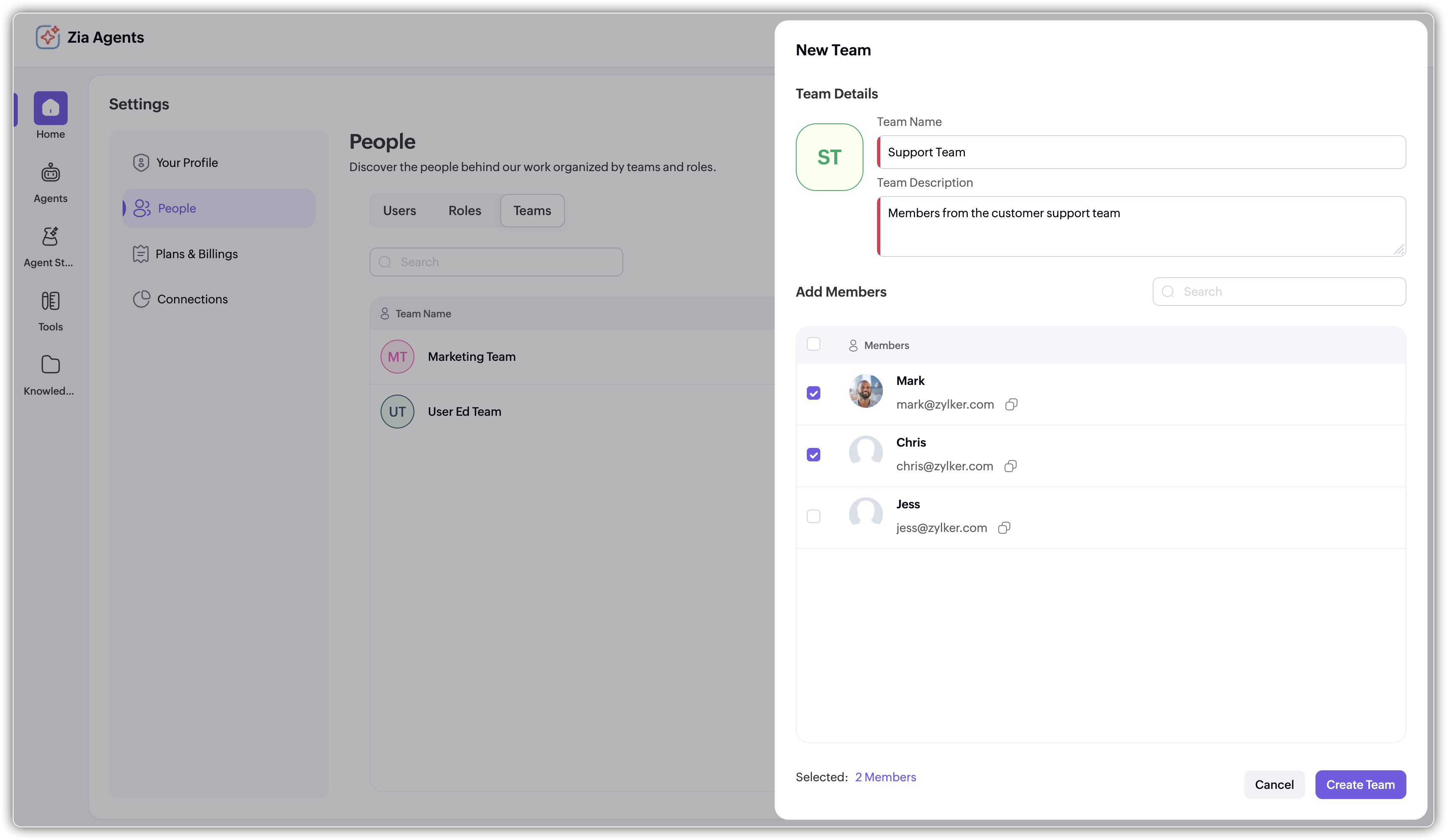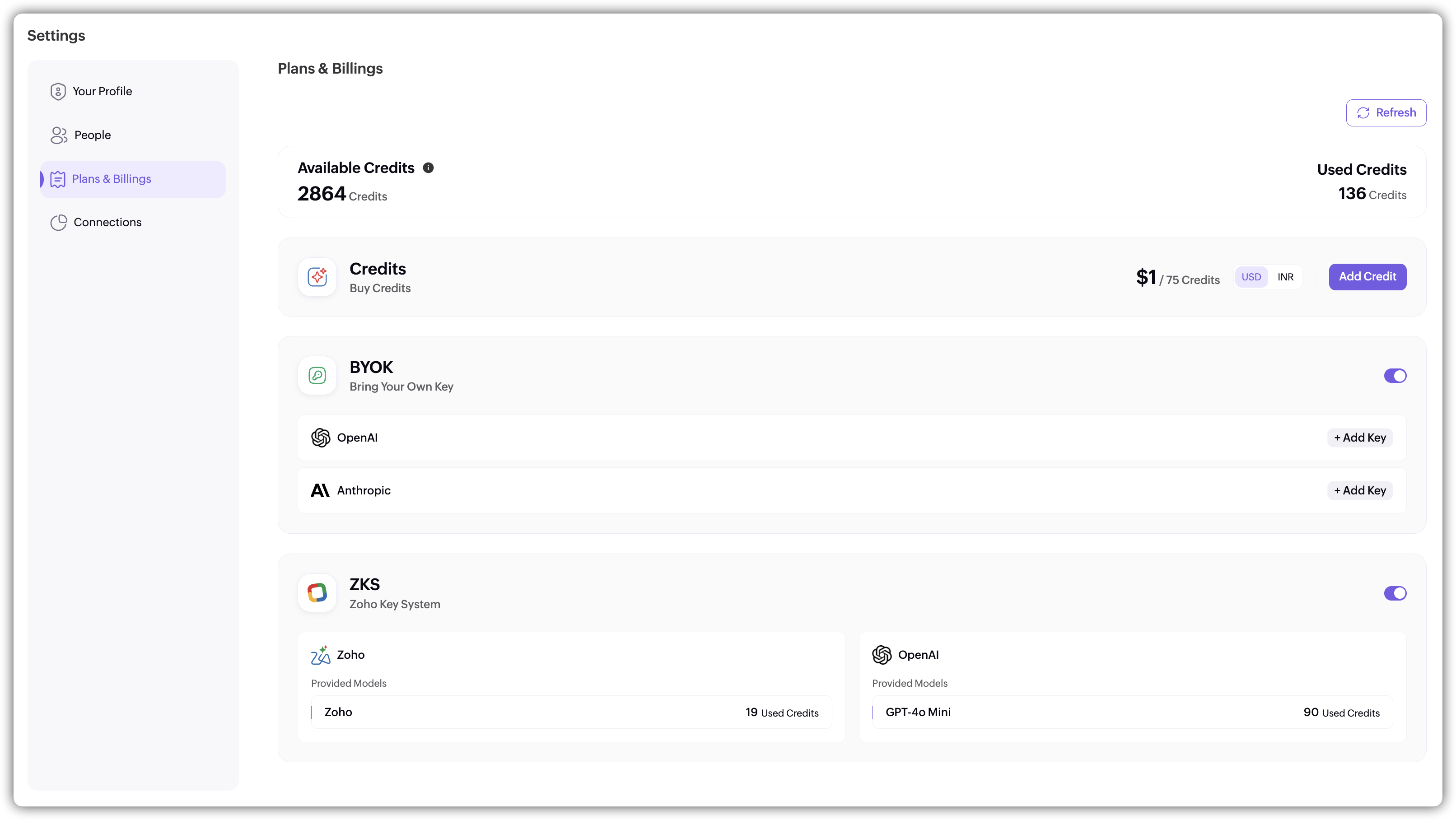 The Settings page is where you shape how Zia Agents works for your organization. It brings your profile, users, roles, teams, billing, credits, keys, and integrations into one place, so you can manage everything without hopping across tabs. Whether you're adding people, adjusting permissions, configuring credits and BYOK, or setting up connections, this is the control center that keeps your Zia Agents setup running smoothly.