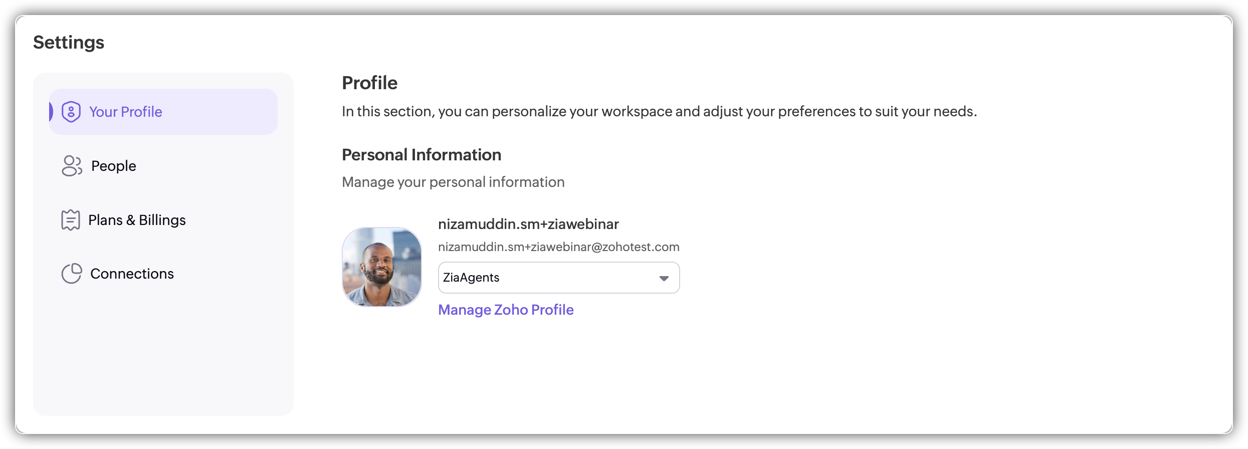 This section contains all the basic details about your profile, including your personal information on the Zia Agents org.