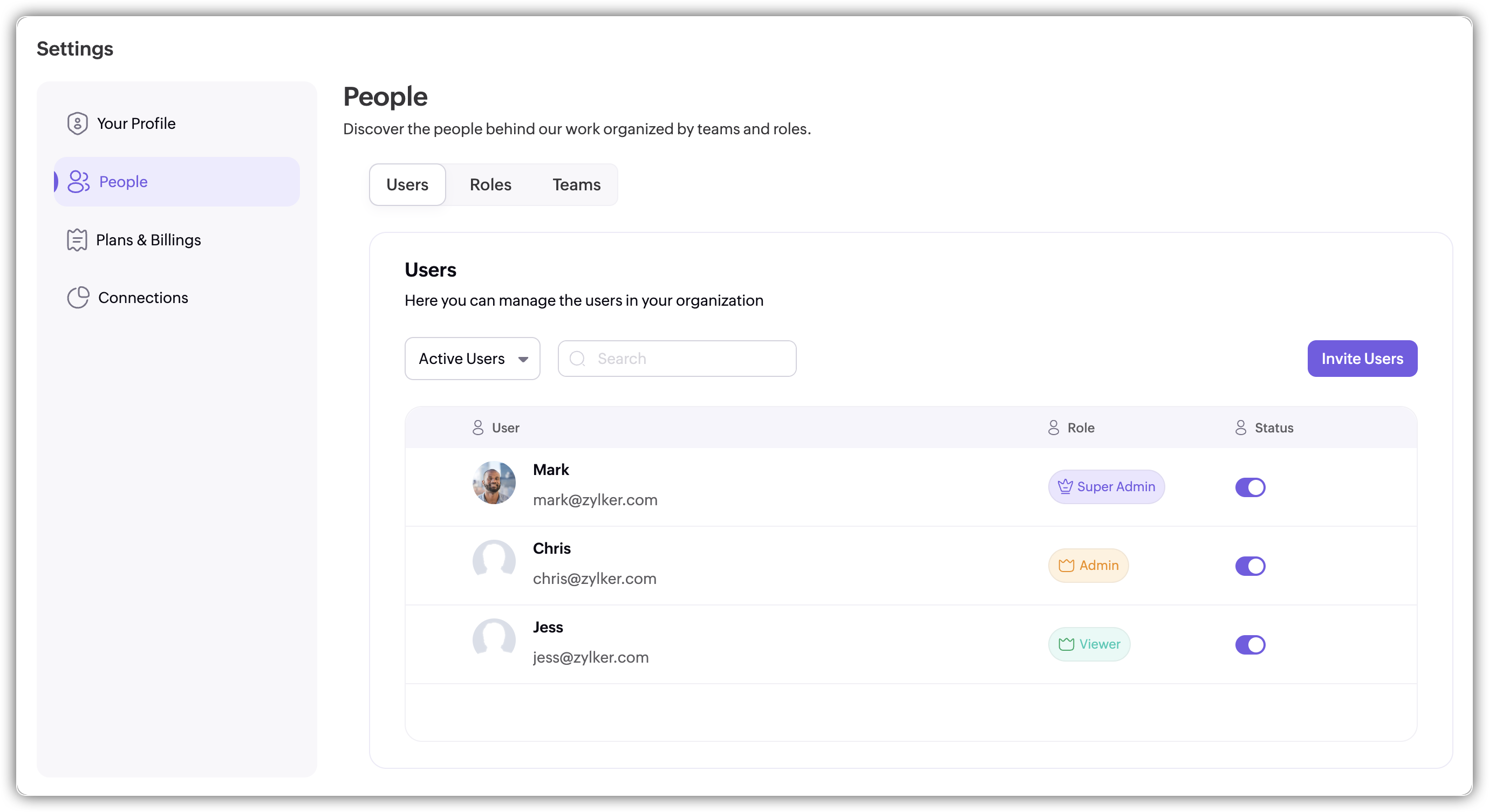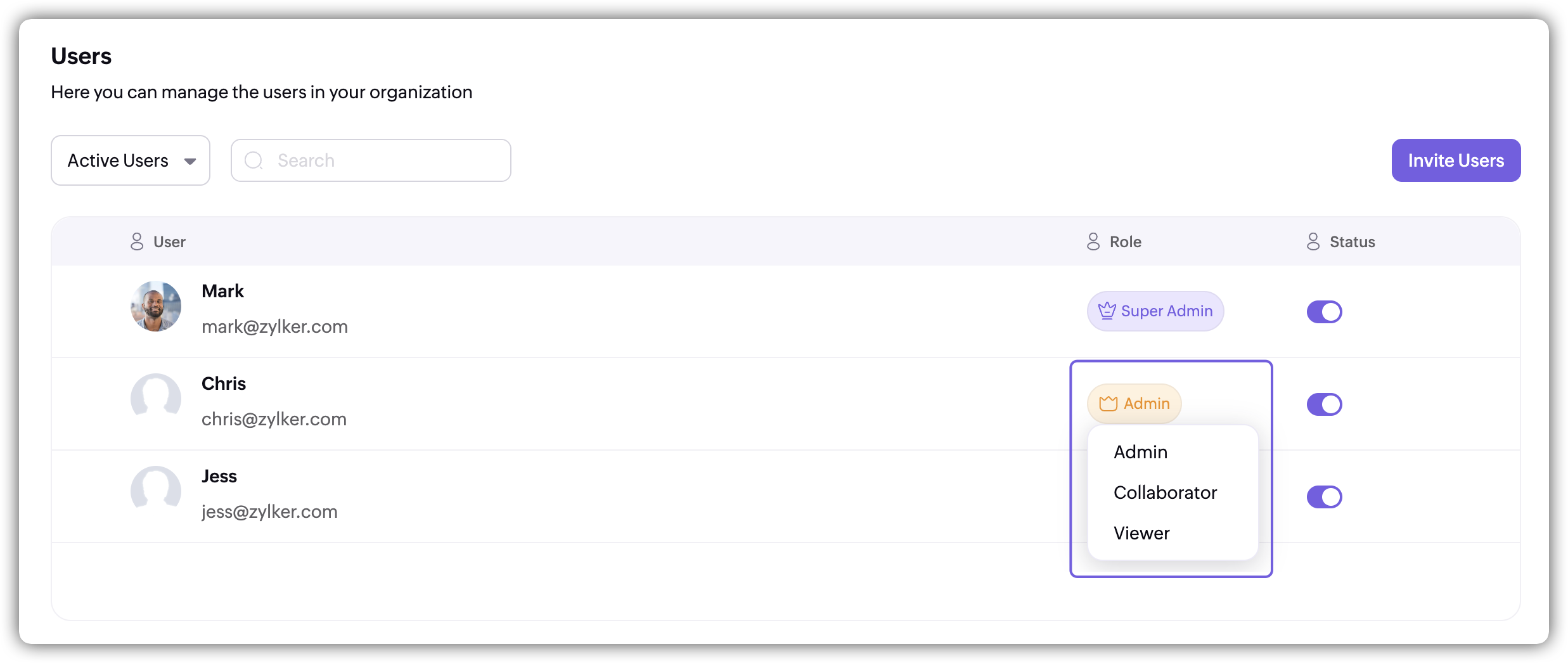As a Super Admin, you will have the options to invite new users, change the role of existing users, mark a user as active or inactive, and delete a user.