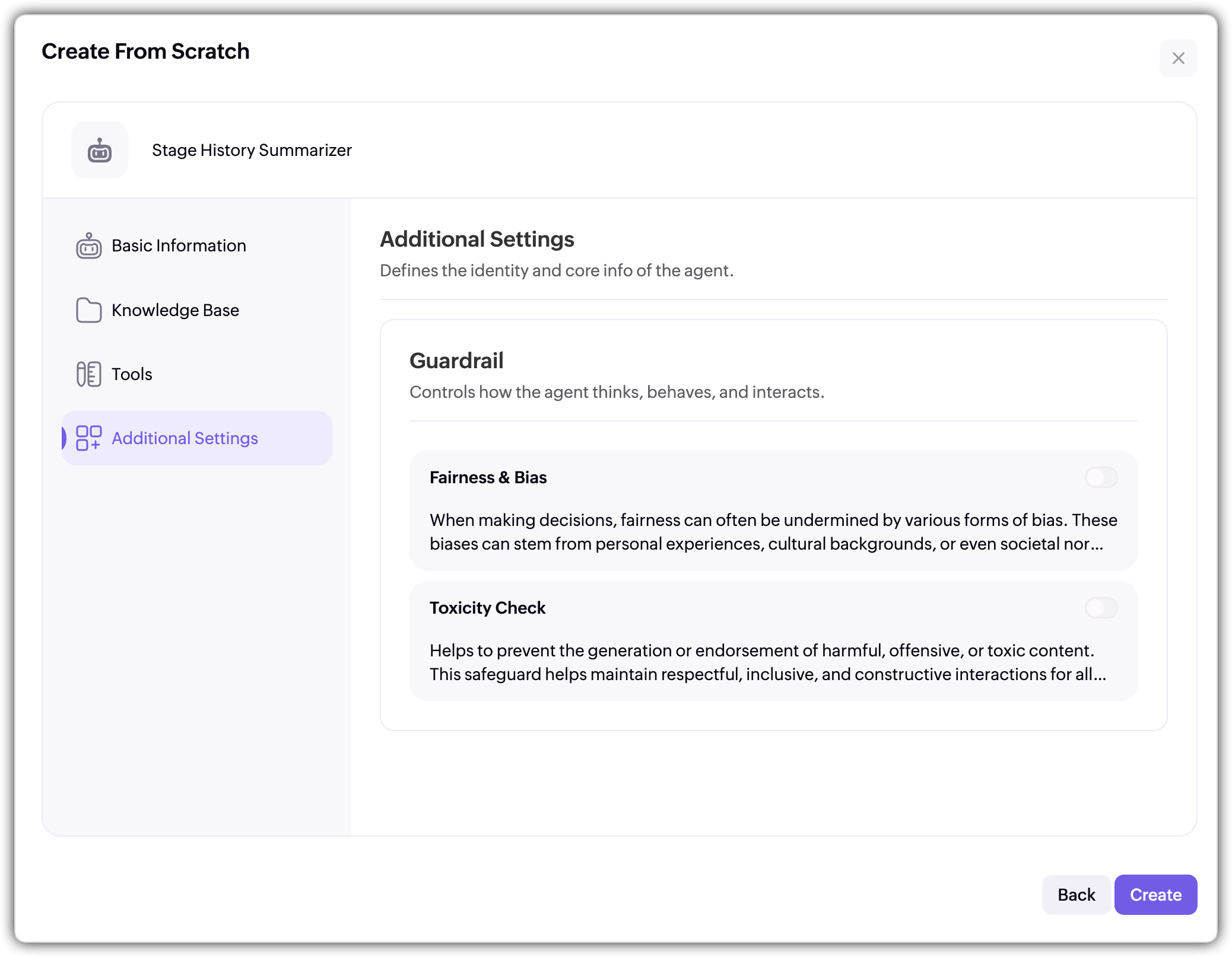 You can enable the default guardrails of your choice to define the agent's identity and core information.