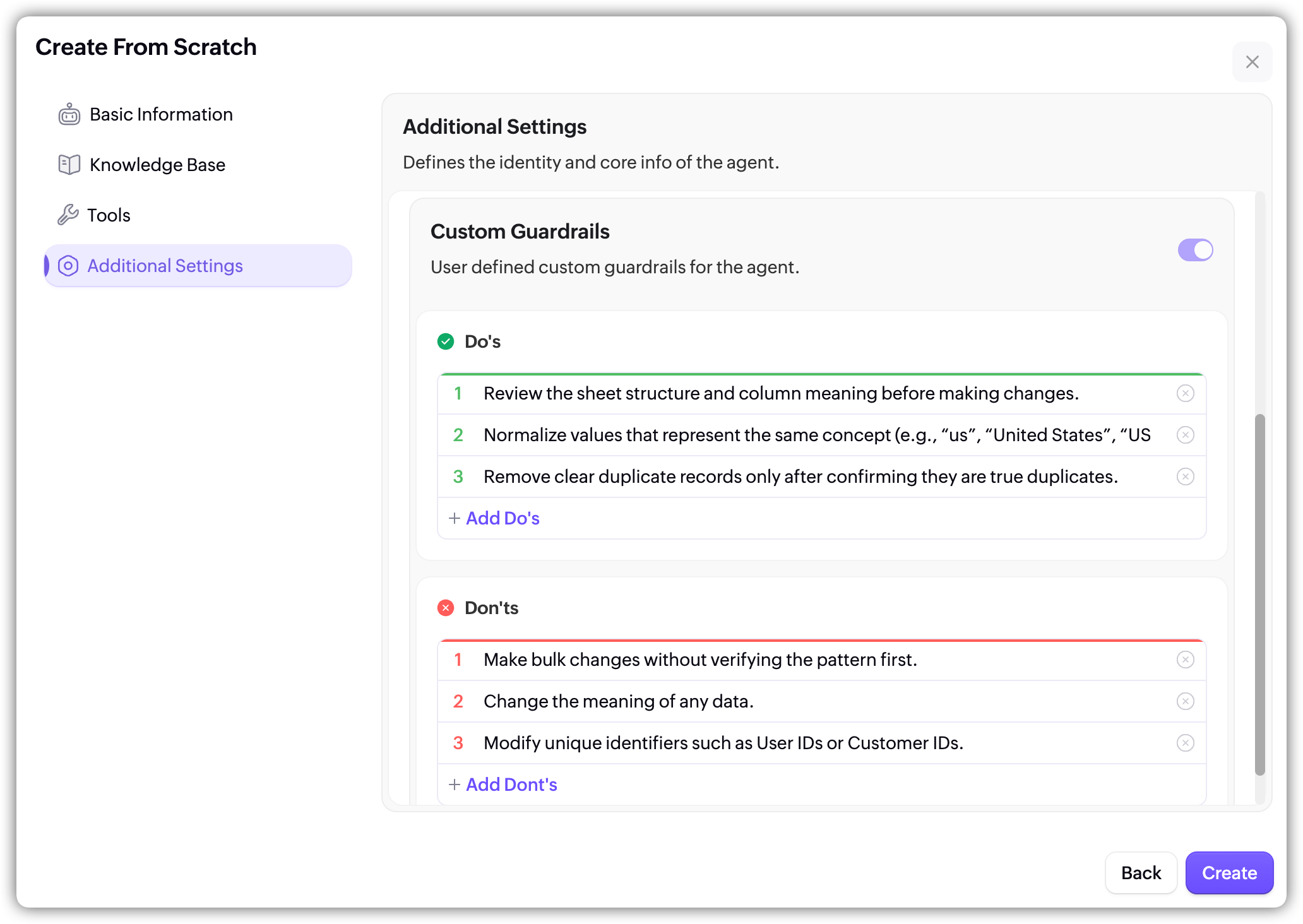 While creating the agent, under Additional Settings, you can enable Custom Guardrails that lets you define rules that guide how the agent should behave. You can specify clear do’s and don’ts to control the agent’s responses and actions.