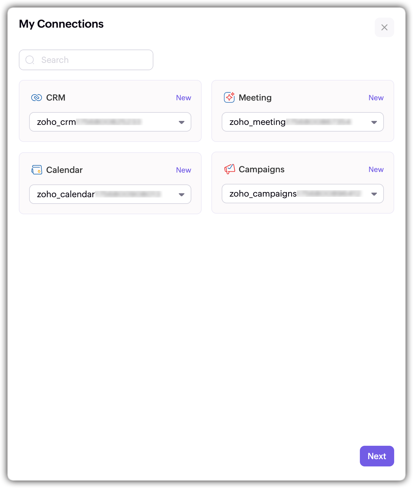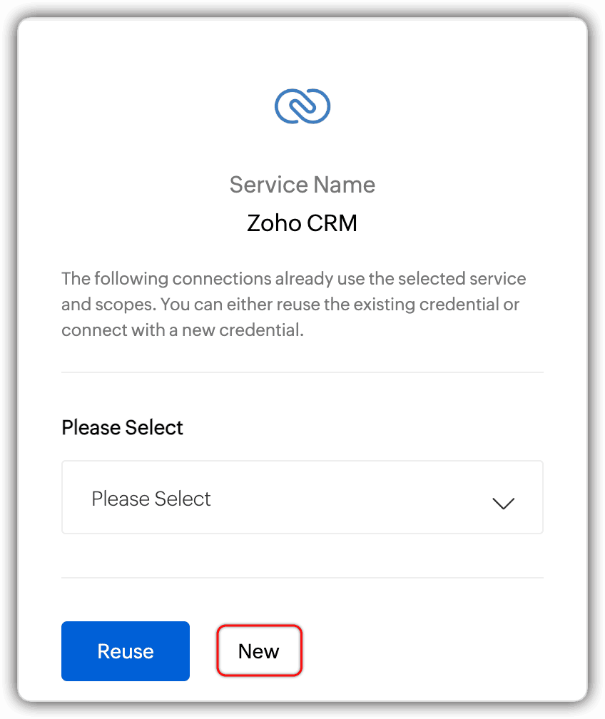 - Choose one of the connections from the drop-down or create a new connection by clicking New against the service you want. Let's say Zoho CRM.