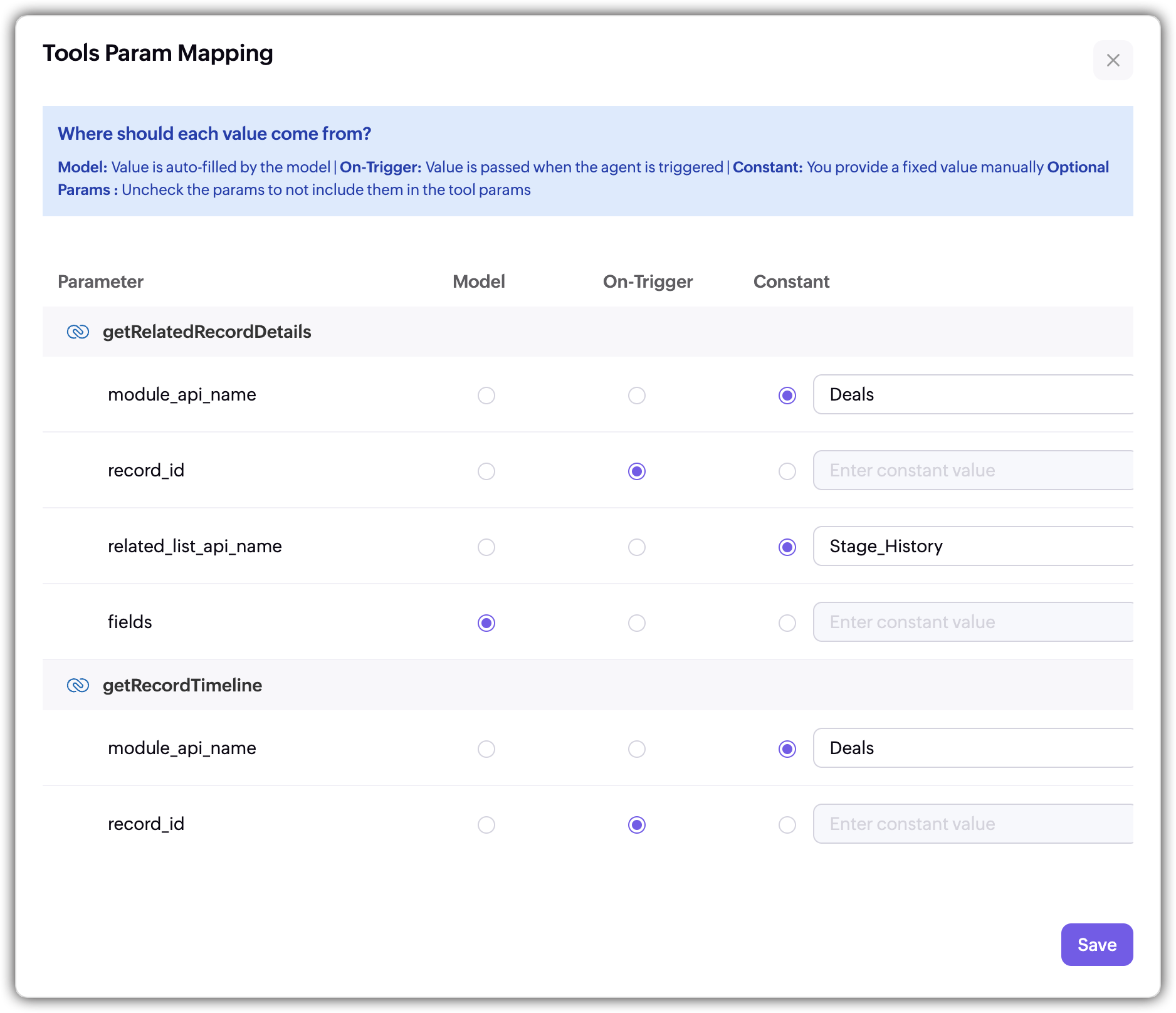 For example, let's say you've configured a button for the record details page of the Deals module to provide deal insights. Here, the record id is the value that should be passed on the trigger of the agent. - Constant: In cases where the agent needs to work with certain predefined values, you can map constant values to the parameters.