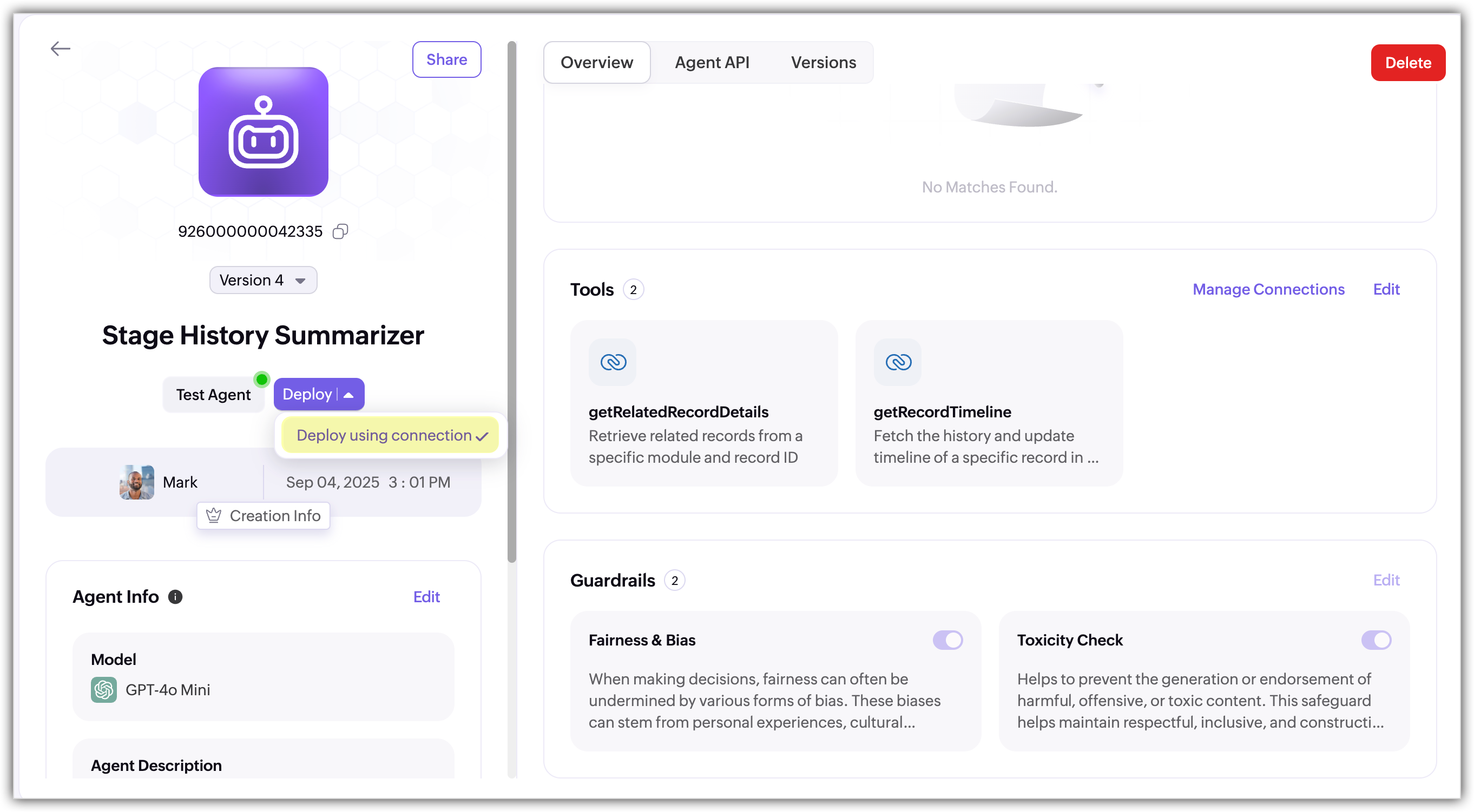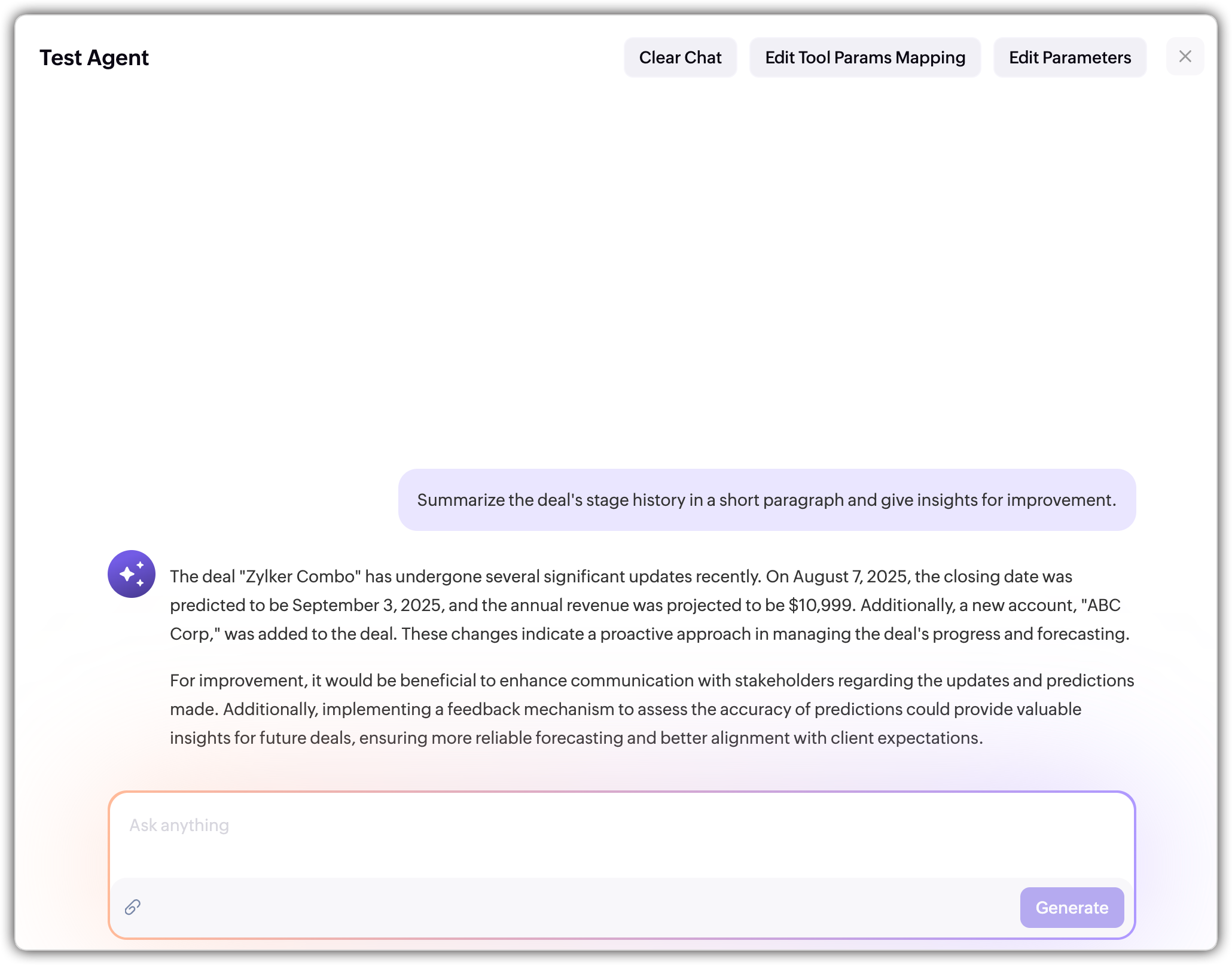 Here, you can ask the agent to perform the intended action based on the tools, connections, and knowledge base that are associated. Let's say summarizing the deal's stage history is the agent's role.