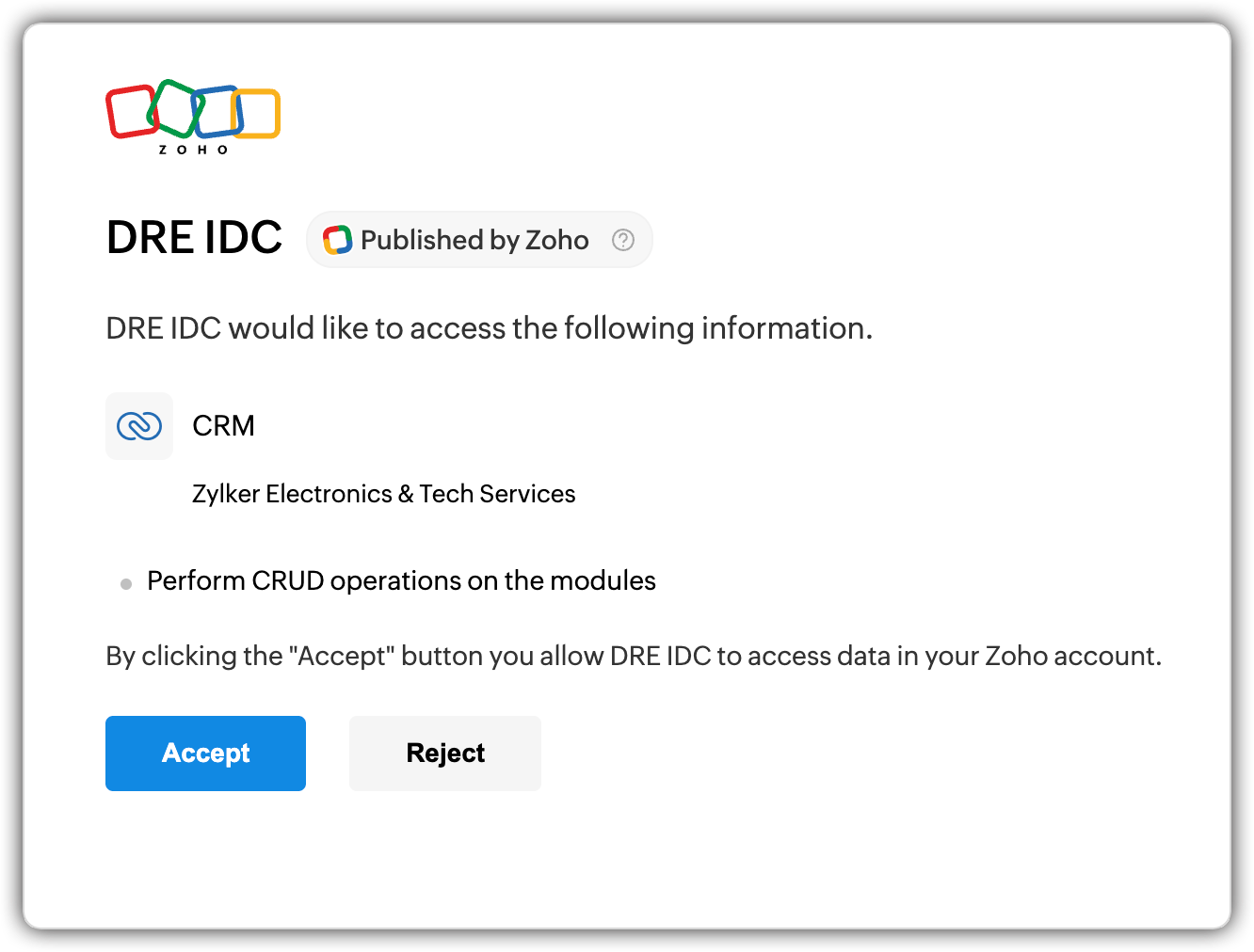 - Acknowledge Deluge's authorization prompt seeking consent to allow Deluge to perform CRUD operations by clicking Accept.