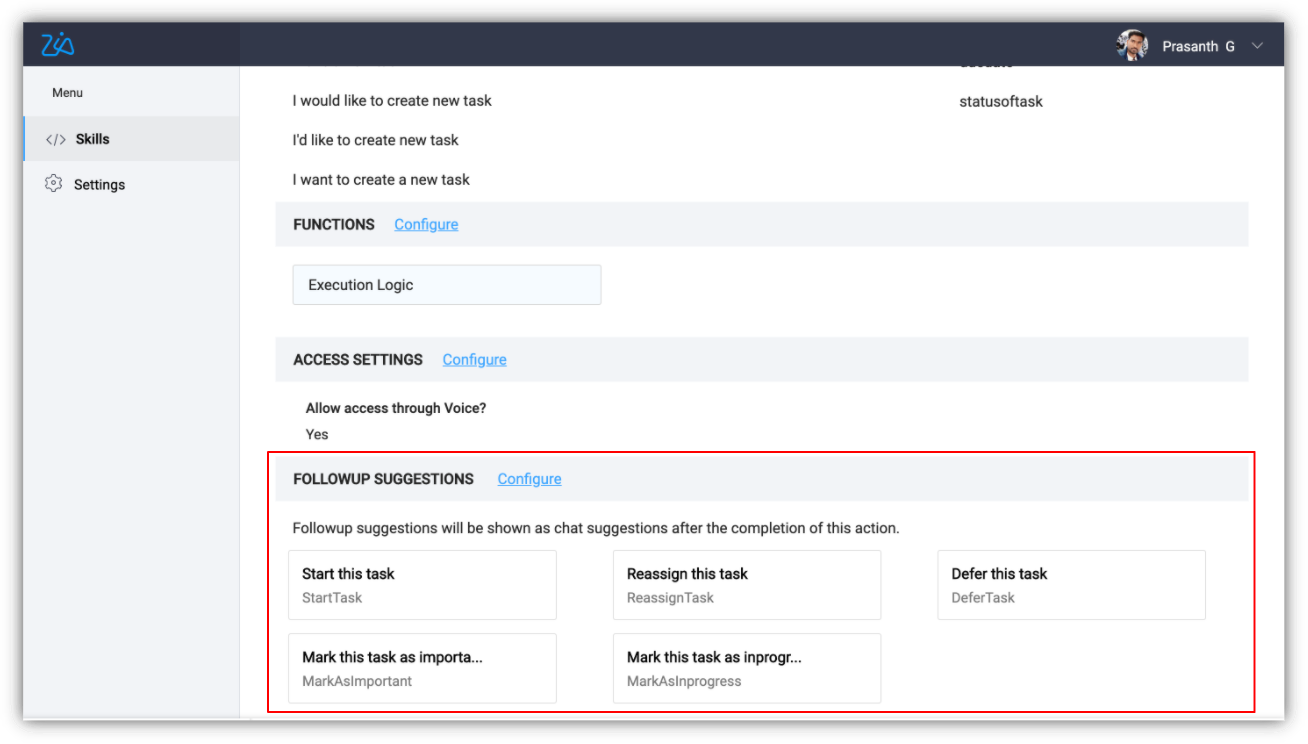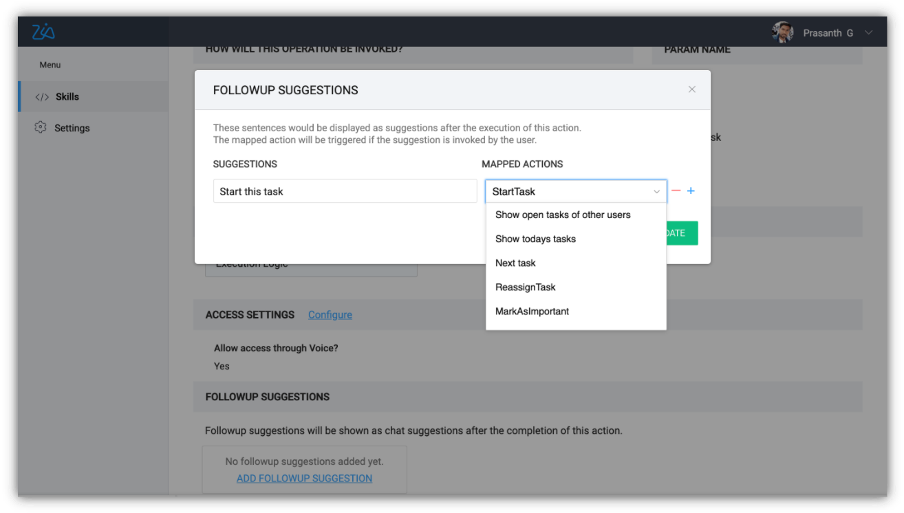 Action Followups defines what the bot should recommend the user after executing an action, in order to engage the user further in conversation. The bot can display a list of suggestions or ask if it can invoke another action, that might be contextually useful to the user after completing an action.