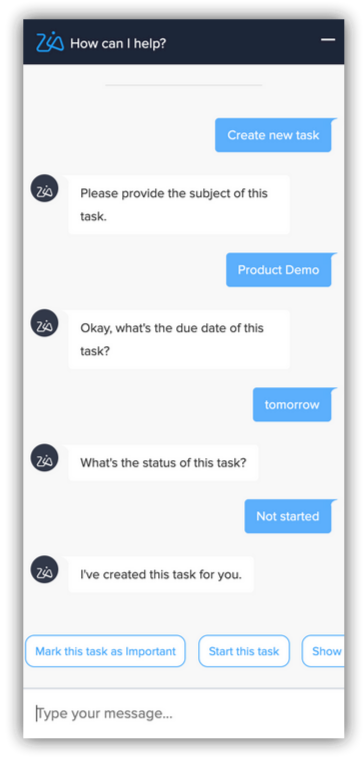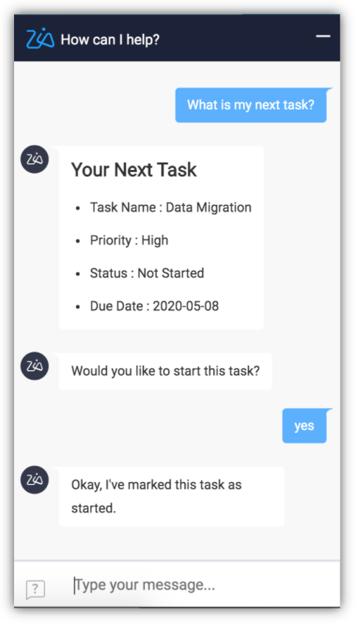 In the same task management bot, the user might have an action to view his next task. After viewing the next task, it would be contextual to ask him, "Would you like to start this task?". The user can reply to this prompt with an appropriate message to invoke the action which would start that task.