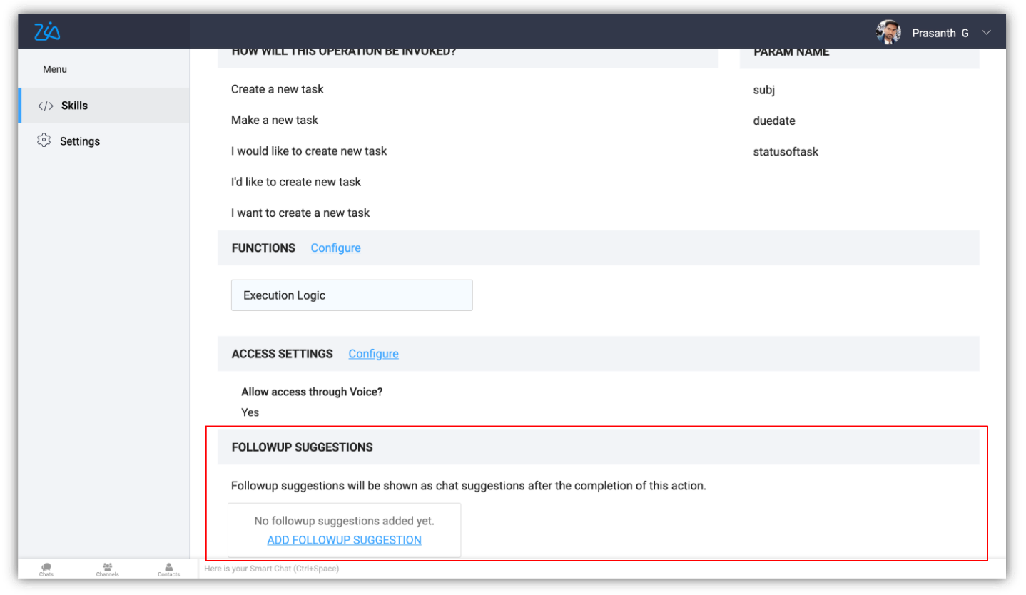 The bot can be made to proactively suggest the users with what more they can interact with the bot. This would facilitate the user to easily trigger the next action that would be contextually helpful, after the execution of an action. By configuring such contextually helpful actions as followups, the bot would immediately display a list of predefined suggestions when the running action completes. When the user selects an apt suggestion, the action configured for that suggestion would be invoked as the next action.