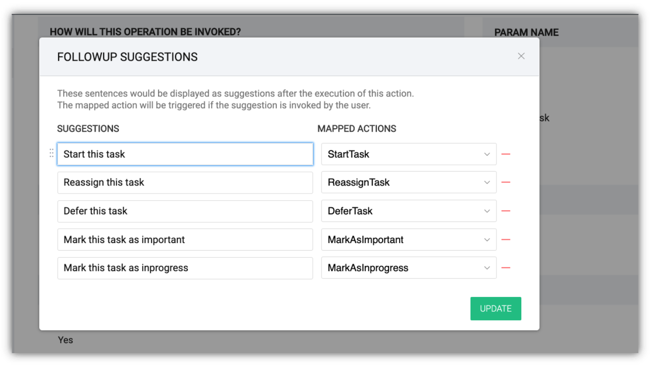 4. Click the UPDATE button after configuring all suggestion texts and their mapped actions.