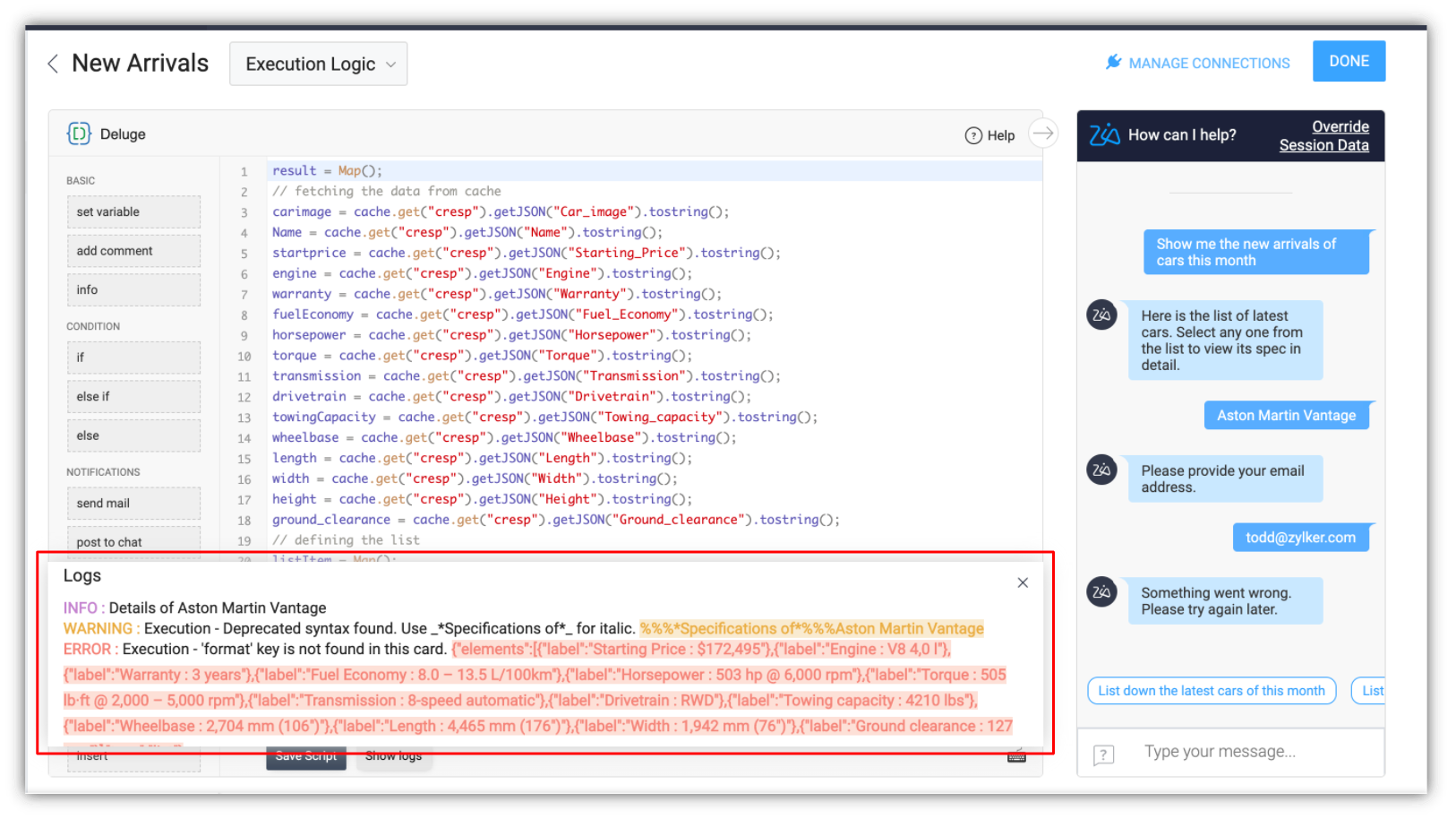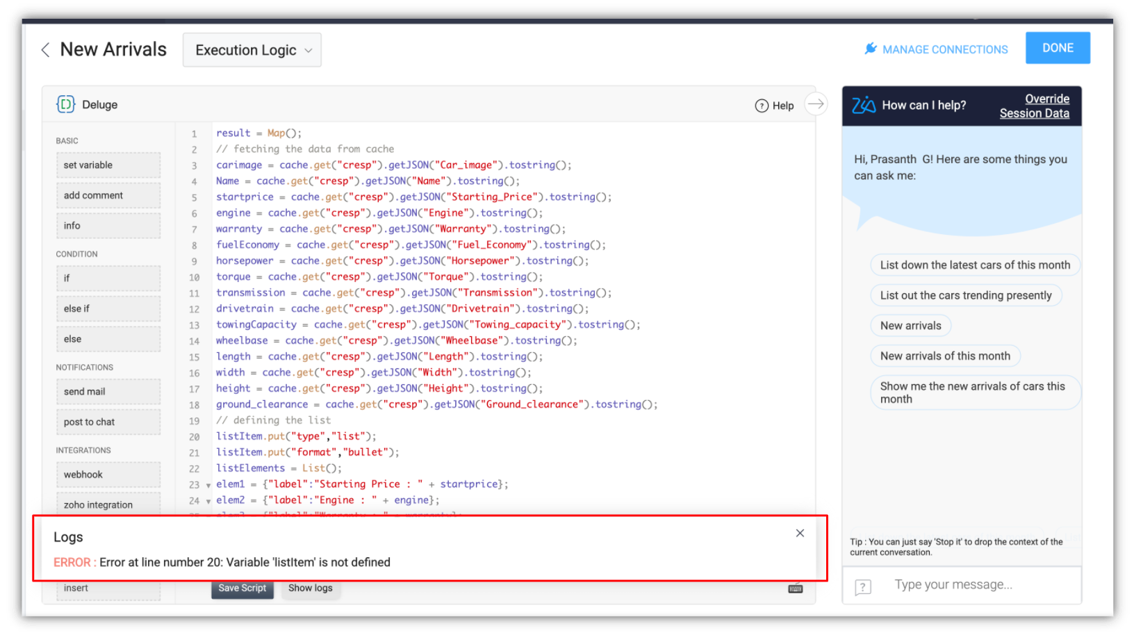 Deluge is the native online scripting language of the Zoho cloud environment. The following are the pre-defined functions wherein you have to define the business logic of your action.