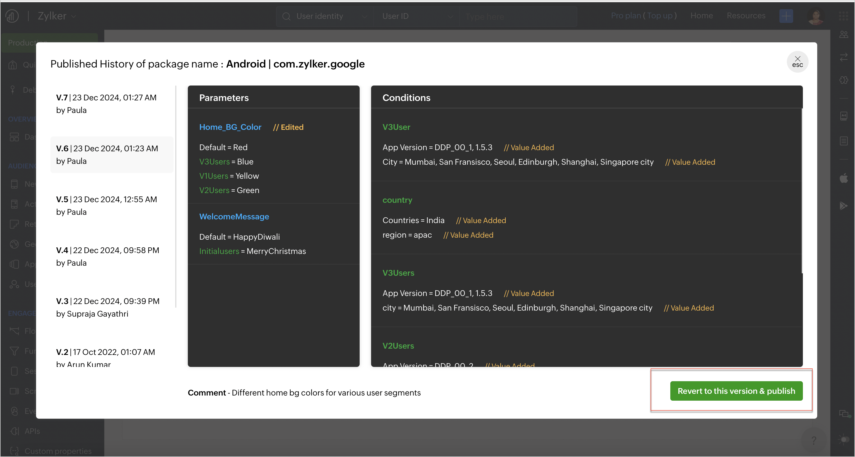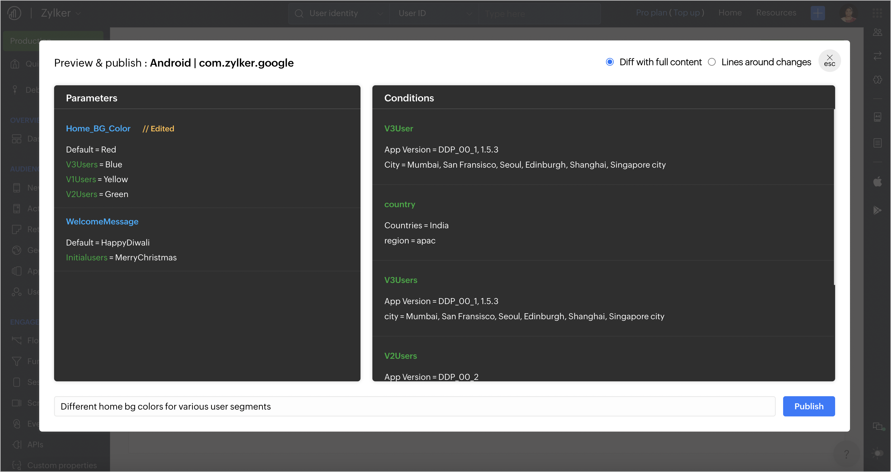 2. Add your comments for future reference and click Publish. Once it is published, the remote configurations and changes will be reflected in the app immediately.
