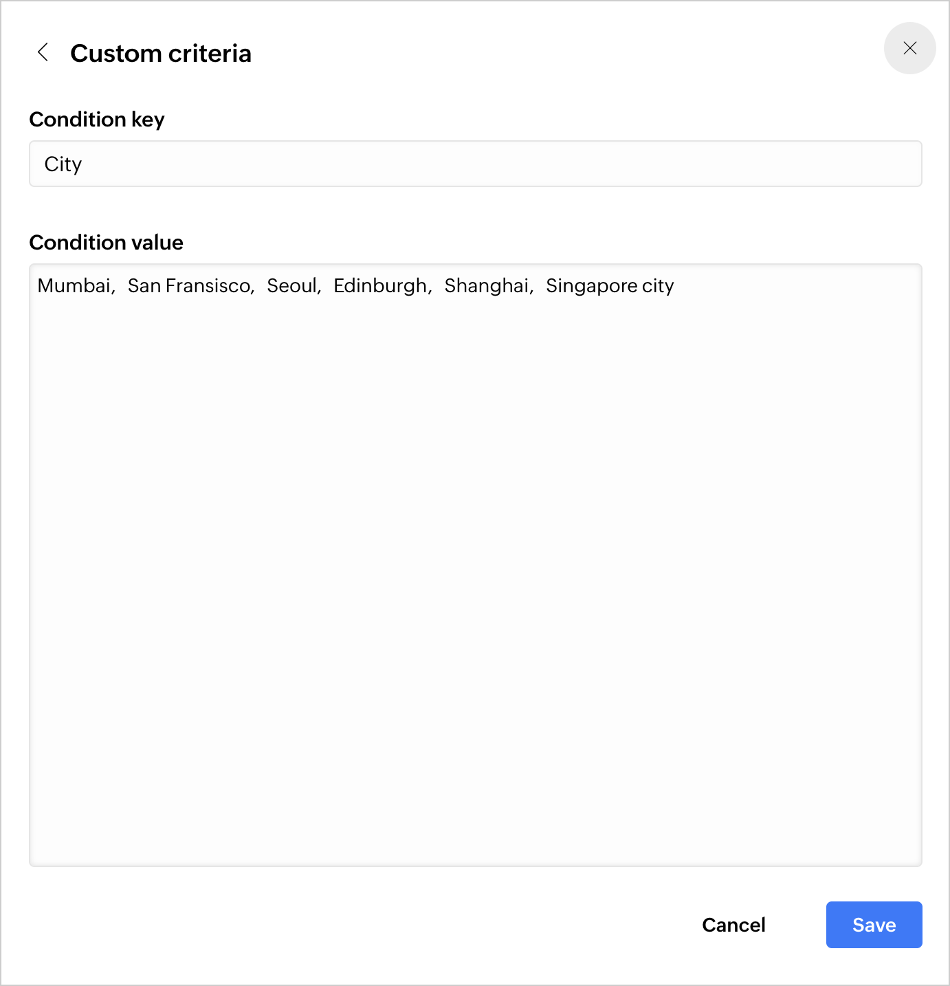 1. To create a custom criteria, click on Custom criteria, provide the condition key and comma-separated values, and click Save.