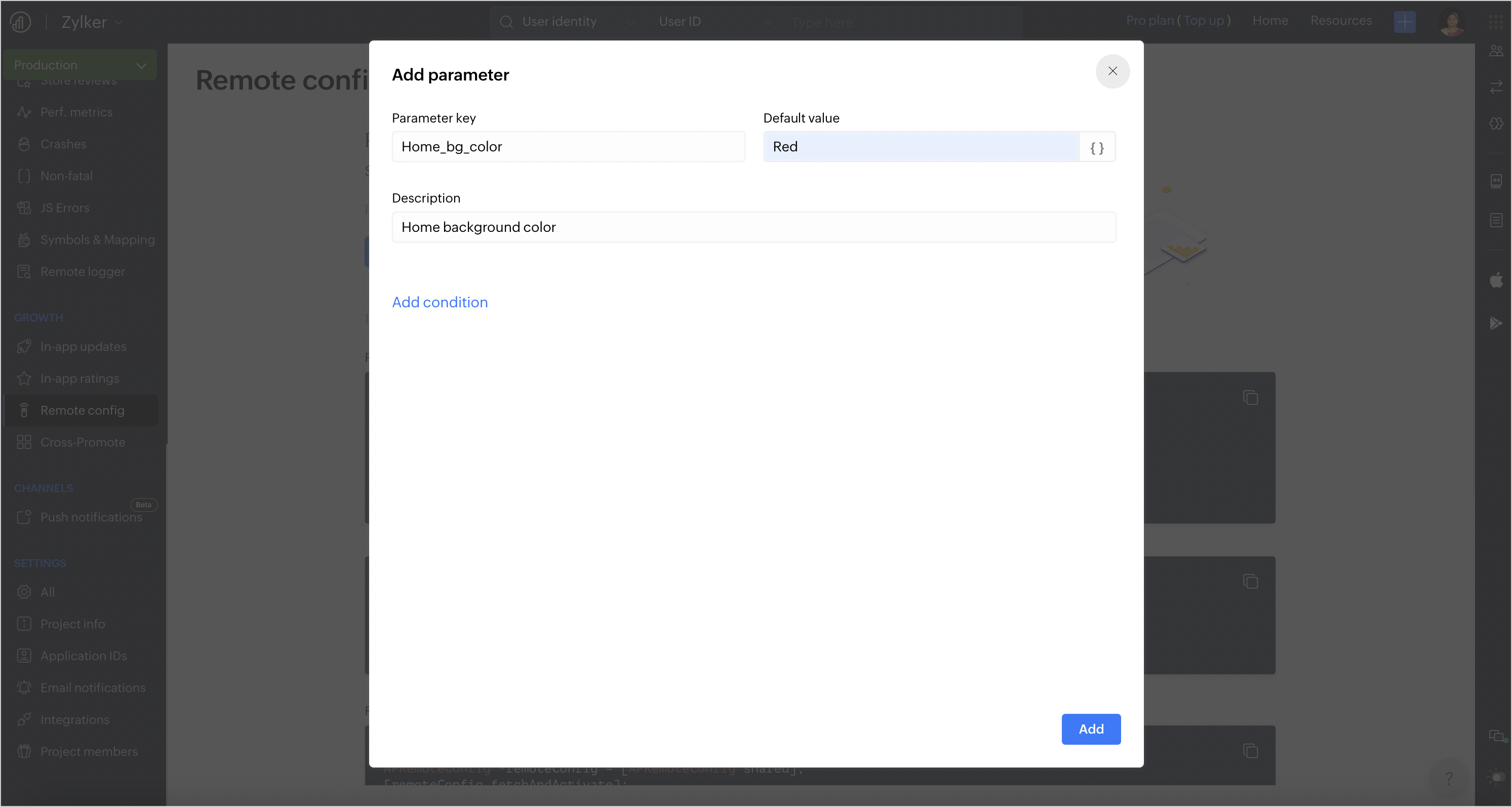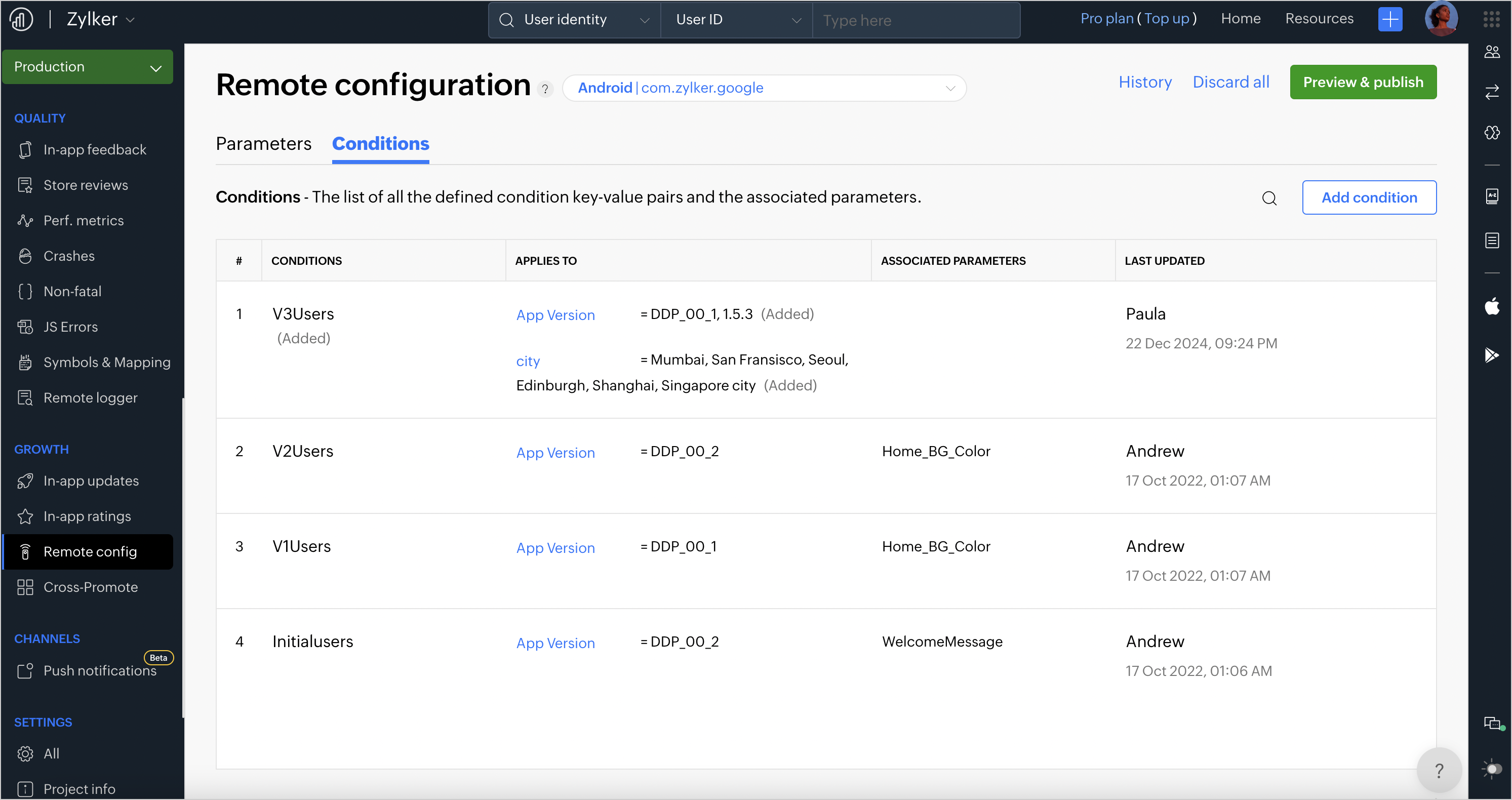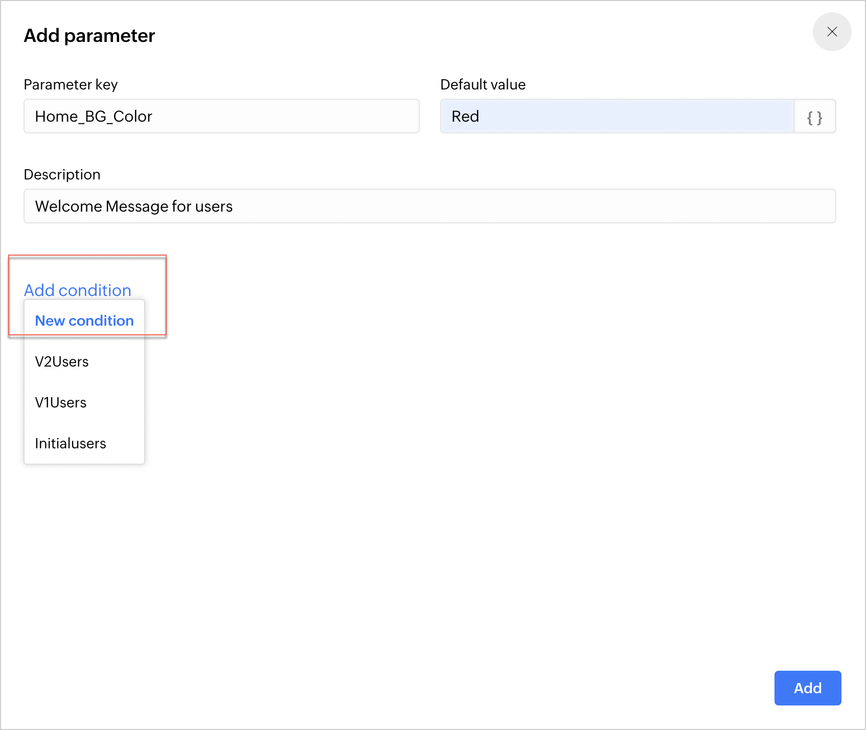 Conditions in Remote config can be added either while adding new parameters, or from the Conditions tab. You can add conditions based on the different criteria: