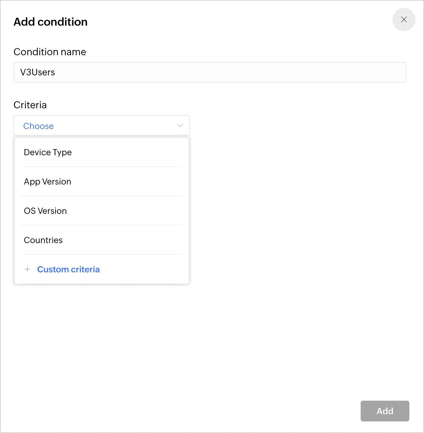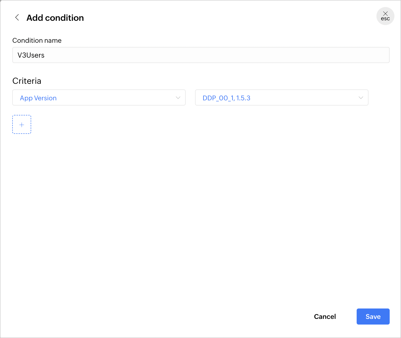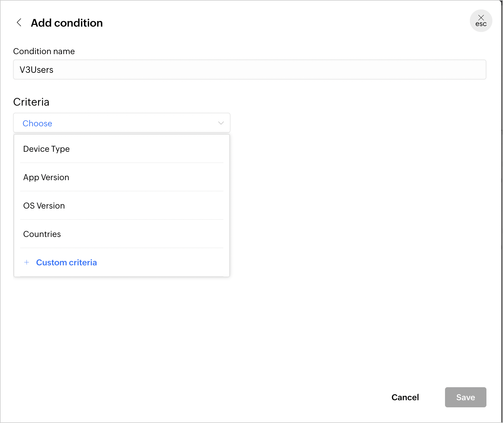 1. Add a unique condition name and select the condition criteria that you want to configure. You can either select from the default criteria filters like device type, app version, OS version, country, or create your own custom criteria for the condition.