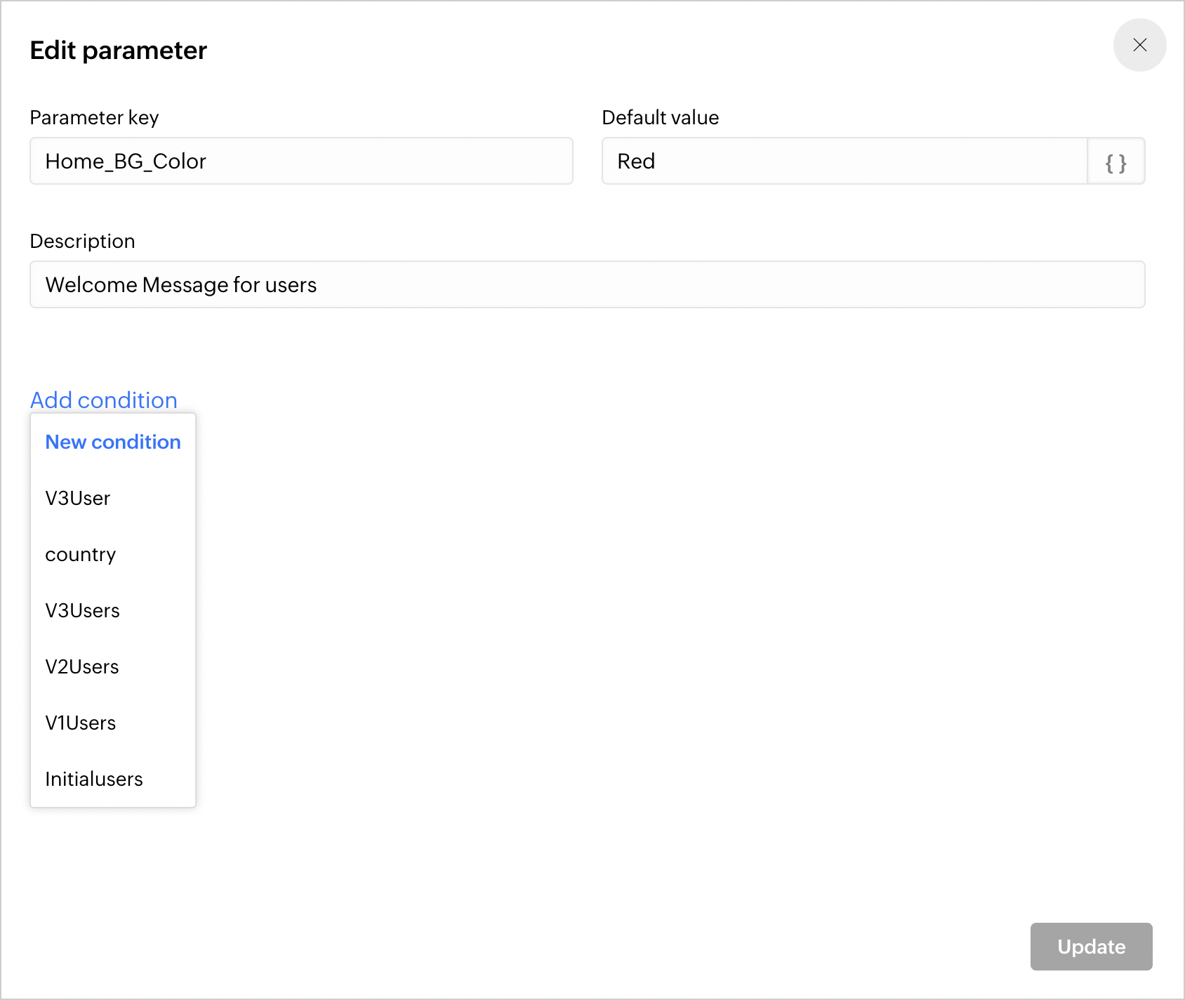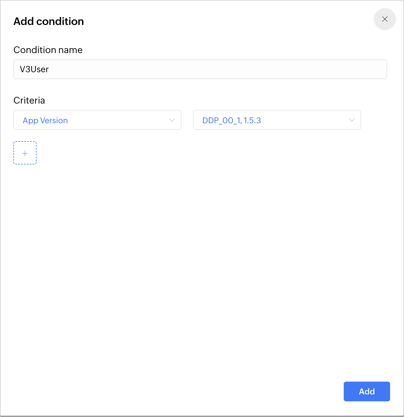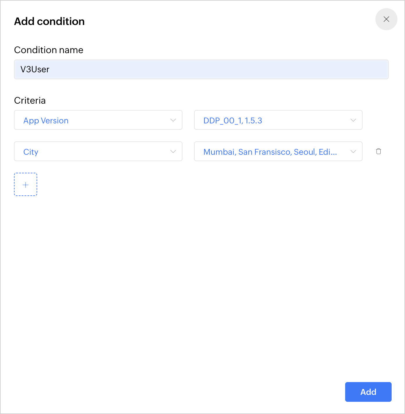 1. Add a unique condition name and select the condition criteria that you want to configure. You can either select from the default criteria filters like device type, app version, OS version, country, or create your own custom criteria for the condition.